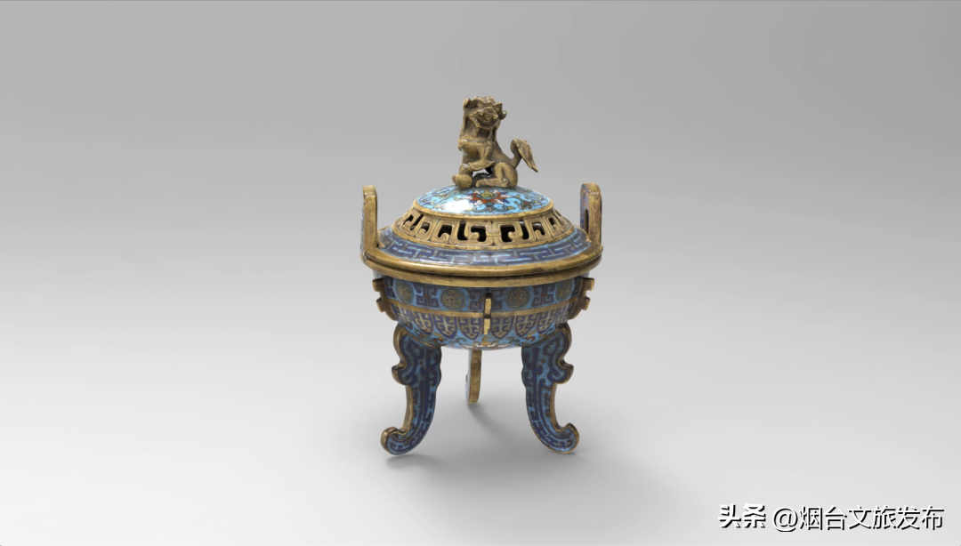 明景泰年间,珐琅的制作工艺日趋成熟,尤其是蓝釉料有了新的突破,因此历史上便有了“景泰蓝”之美誉。到了清代,掐丝珐琅器成为清宫生活的重要部分,康熙及乾隆年间的珐琅器制作水平尤其高。此件三足狮钮熏香薰,造型古雅,雕工细致,立耳,圆腹,腹上有岀戟装饰,片形高足,盖上狮钮威严肃穆,炉盖有一圈镂空雕纹,镂空盖可开合,极具灵性,充满力度和动感,另配有珐琅描金小铲一只,非常精致。香薰工艺复杂,制式大气,空灵而不空洞,包浆厚泽,鎏金保存完好,历经多年流传,可感其工艺精美,具有很高的艺术和收藏价值。
