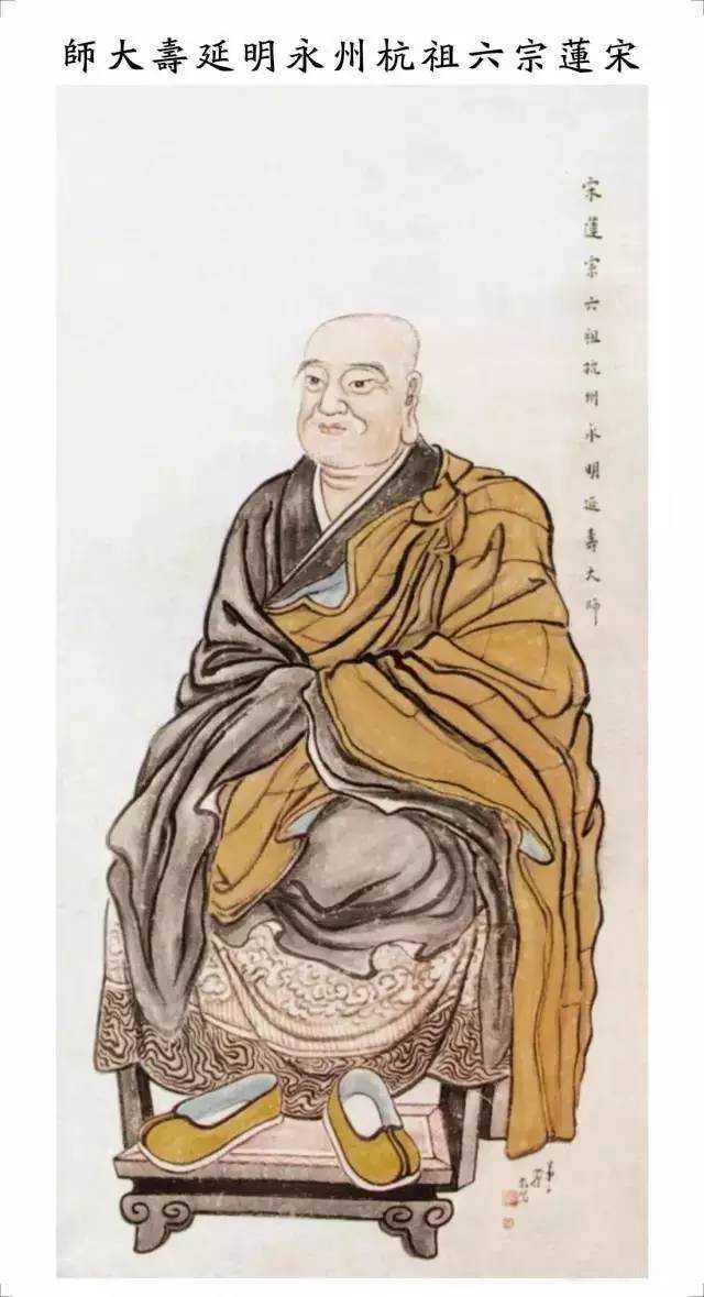 宋朝杭州慧日山永明寺延寿大师(904年-975年),浙江钱塘人。又名智觉禅师,二十岁时一心归佛,日中一食,常诵“法华”。年二十八,为华高之镇将。年三十乞吴越王,舍官位,投“龙册寺”“翠岩禅师”门下剃度出家,行苦行头陀。行善好施,戒杀放生。初出家本为禅门法眼宗第三代祖,后归心净土,精进念佛,每日日诵弥陀经,佛号十万声。著有《宗镜录》百卷及《万善同归集》等传世。