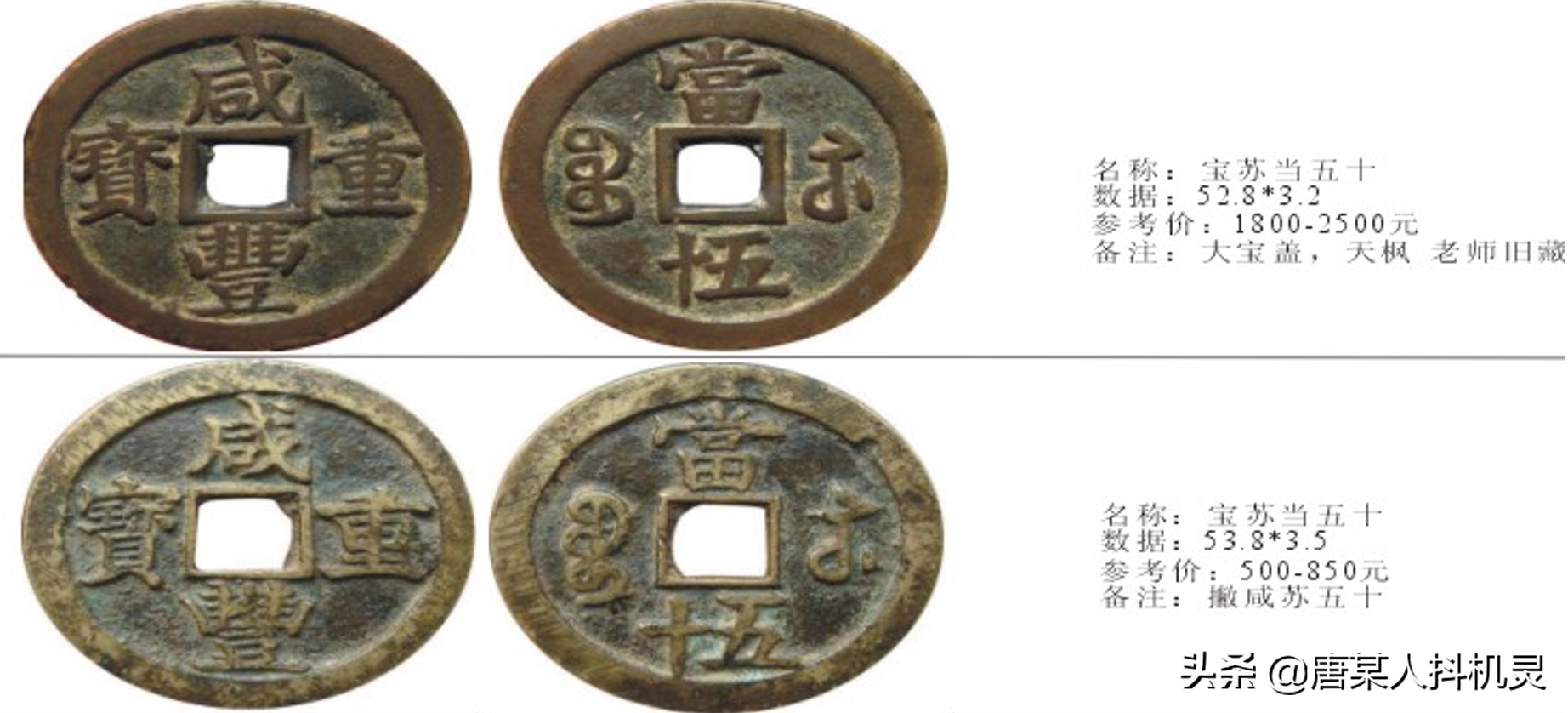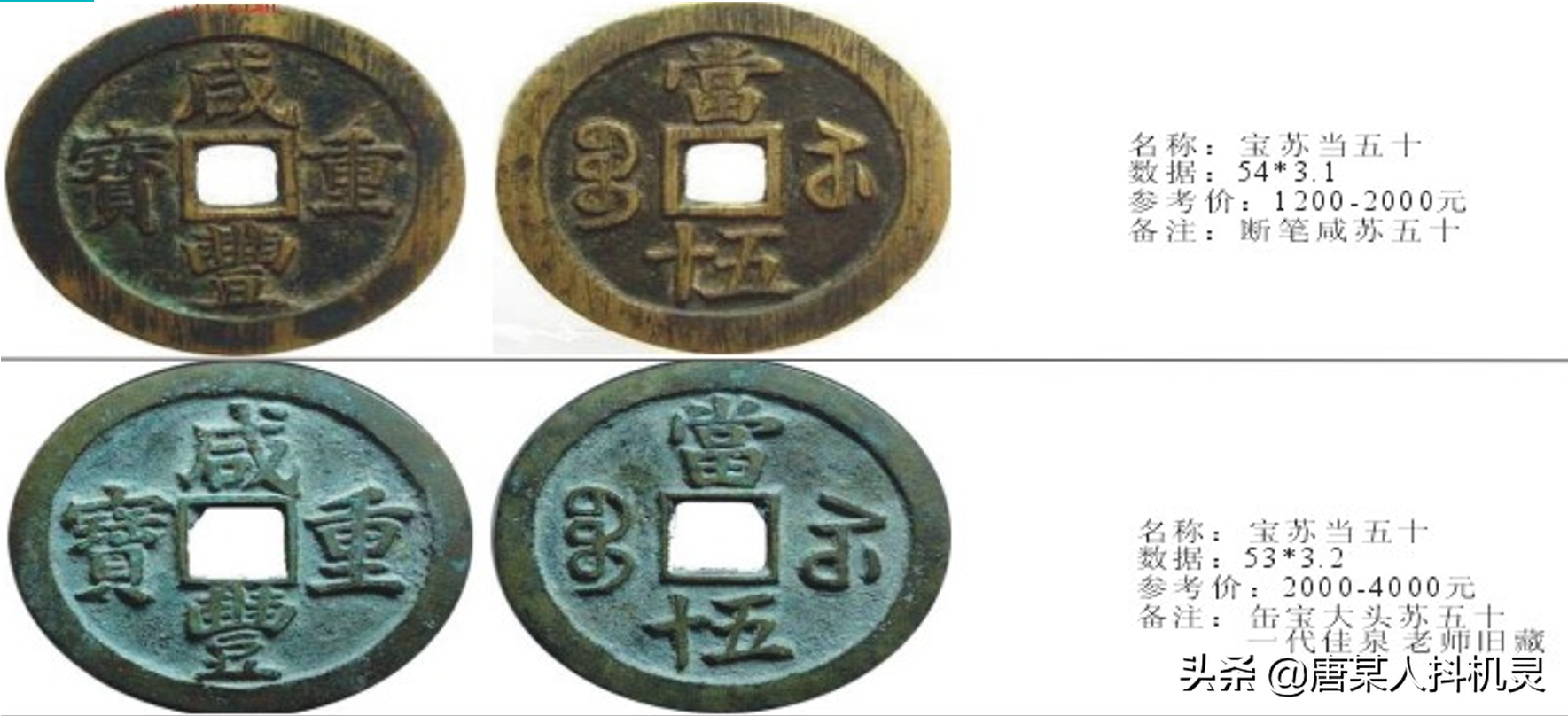 宝苏局,江苏省局铸,铸造量大所以存世量较多,版本在咸丰钱中最为多样,有见小平、当十、当二十、当三十、当五十、当百和当千多个等地。