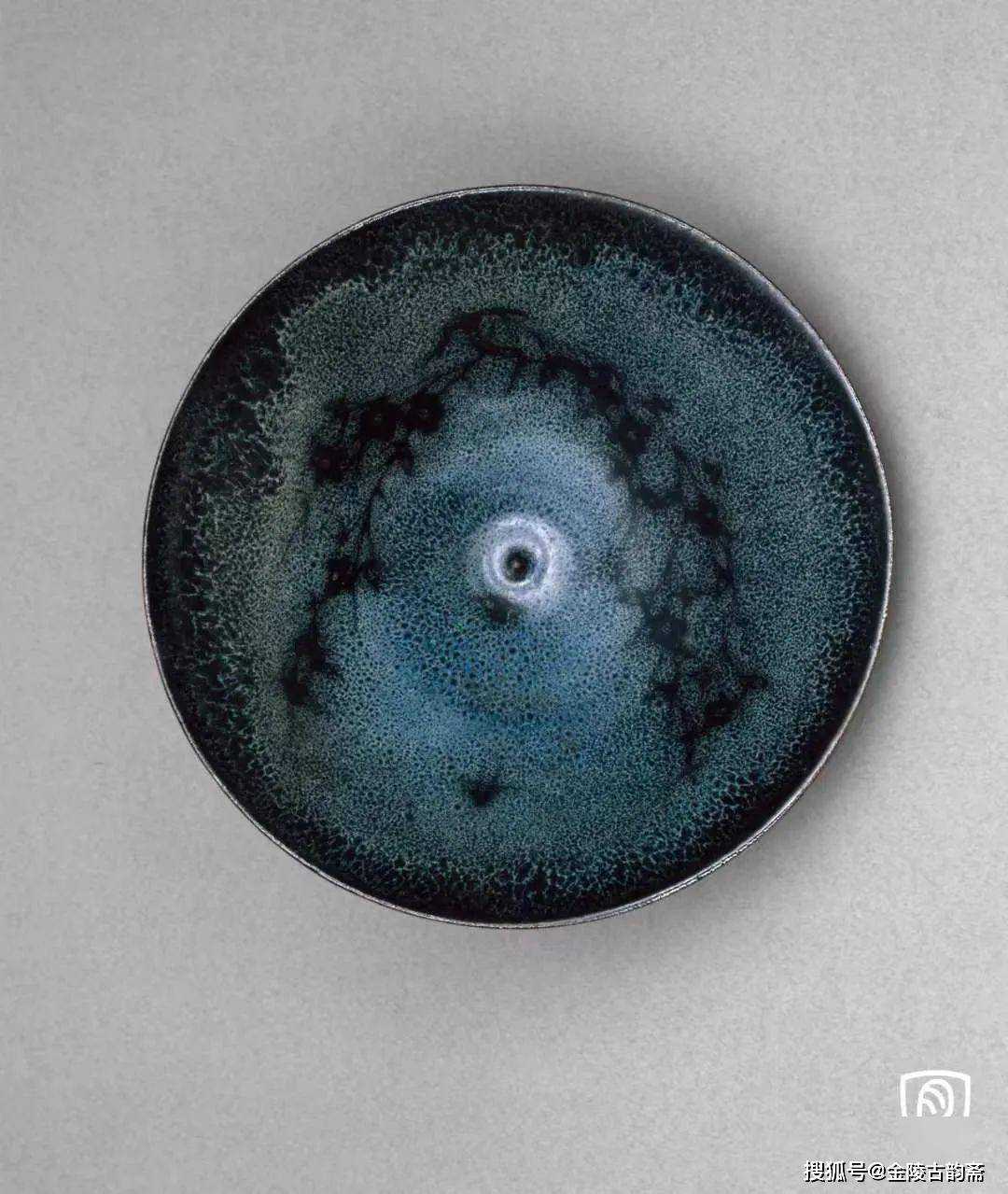 最后就是第一名蓝吉州啦~是很多人的心头好,这只蓝吉州区别于大部分的吉州窑剪纸贴花盏,呈现出令人惊喜的蓝釉底色。是目前发掘出的独一无二的剪纸贴花盏,盏的外部覆盖着一层深褐色的釉,而内部则呈现出少见的蓝色窑变底釉,装饰着月下梅枝飘渺的花形,又似在碧波潭中被风吹起的一阵涟漪。