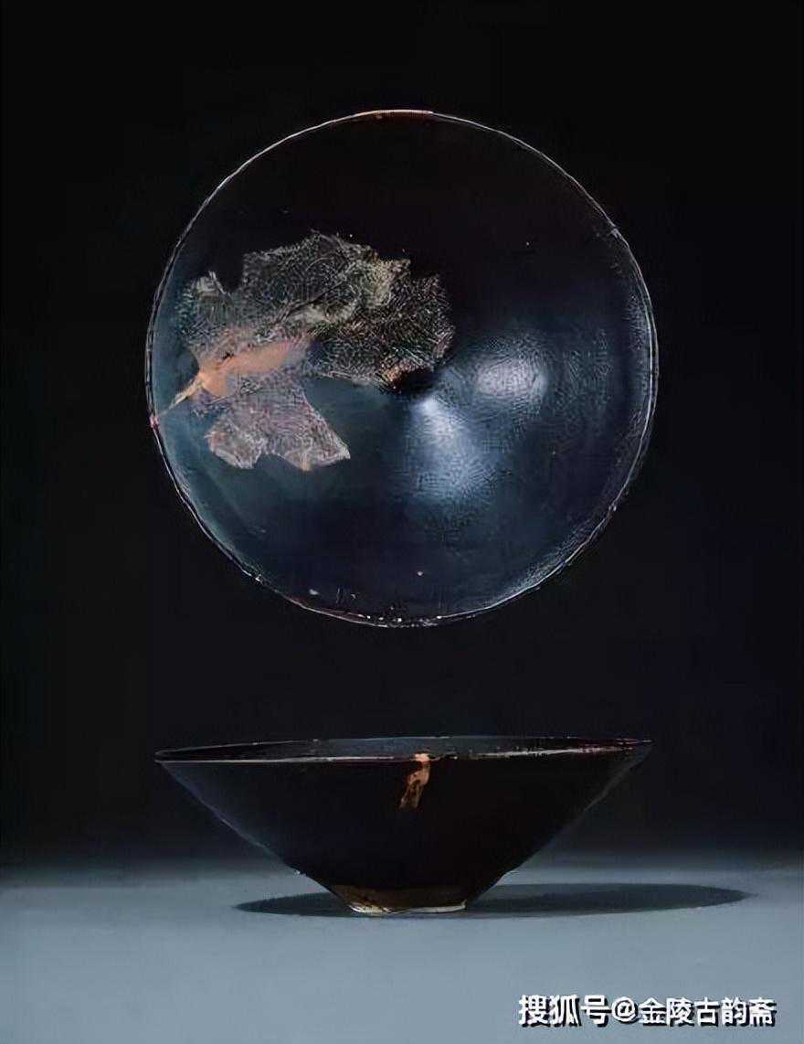 黑釉茶盏因为便于衬托茶沫、观测茶色而倍受饮茶、斗茶者的偏好和喜爱。黑釉茶盏因时而生,且数量占有宋代瓷窑的三分之一以上。又因为斗茶与文化内涵联系在一起,斗茶者对斗茶活动的每一个细节尽善尽美的要求,茶盏工艺由此精益求精,木叶纹茶盏正是在这种历史背景下出现的陶瓷精品。
