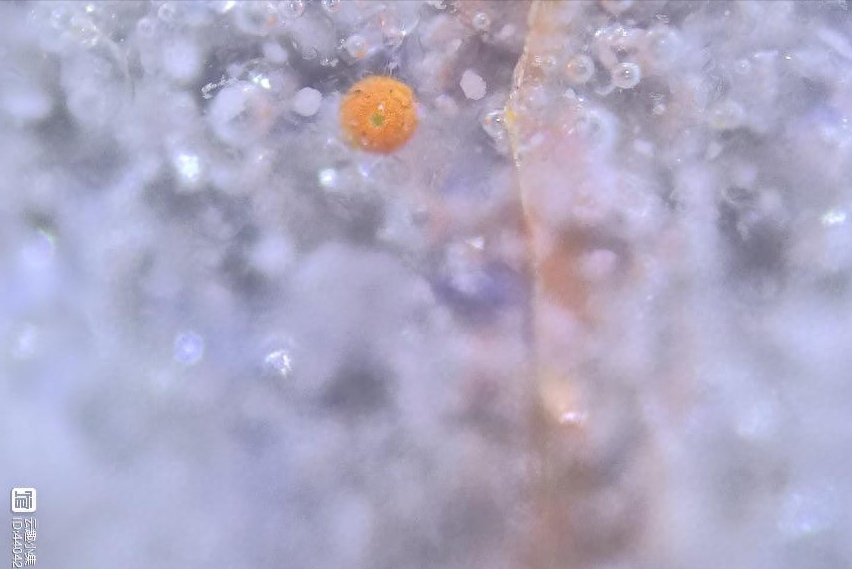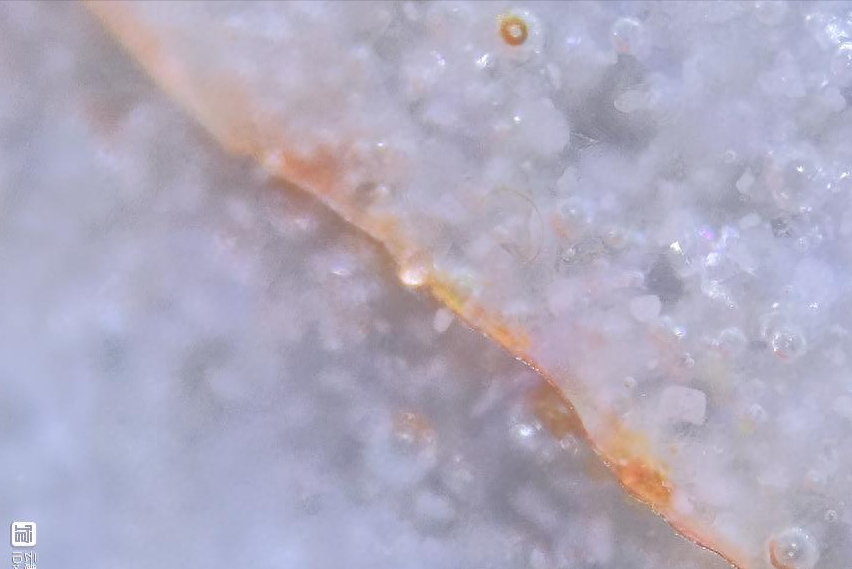 3、用显微镜观察,可见釉下气泡较小,相对较稀,但有少部分特大的气泡,与其它气泡相比大出上百倍,可见有变色气泡(有人叫死亡气泡)和破泡,釉下还可见大小不一的不规则的白色颗粒状物。