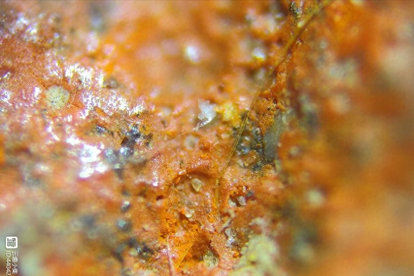 (2)底足部位右侧淡鳝血色斑块及显微图