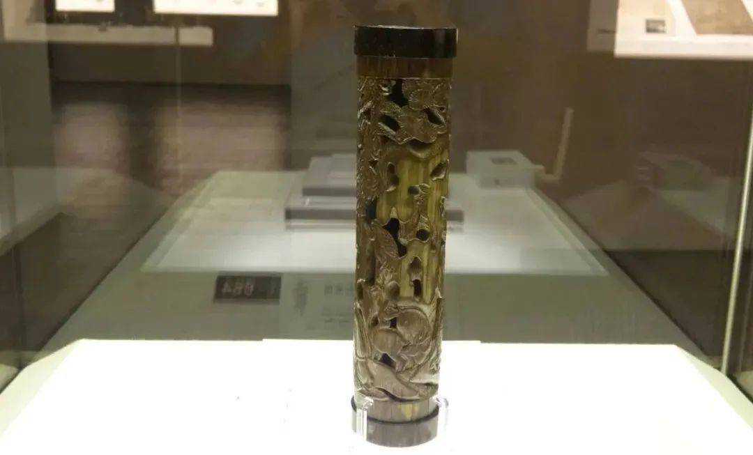 朱守城墓中出土的明代朱缨雕“刘阮入天台竹香筒”,口径3.7厘米,高16.5厘米。此件竹刻香筒,描绘了刘晨、阮肇入天台后与仙女弈棋的情景,有明晚期嘉定竹刻名家“三松”之一的朱小松款,其盖、底皆以紫檀制成,浮雕图螭纹,下刀薄而爽利,螭纹形象生动。刘阮入天台的典故出自《太平御览》卷四十一引南朝宋·刘义庆《幽明录》:传说刘晨、阮肇入天台山,迷路不得归,后遇见两位仙女,遂成就一段美好姻缘,半年后求归下山,至家中方知已过七世。后以此典指男女间爱恋情事;或以“刘郎、阮郎”等指女子的心上人;或以“仙源”、“胡麻饭”等形容仙家生活。