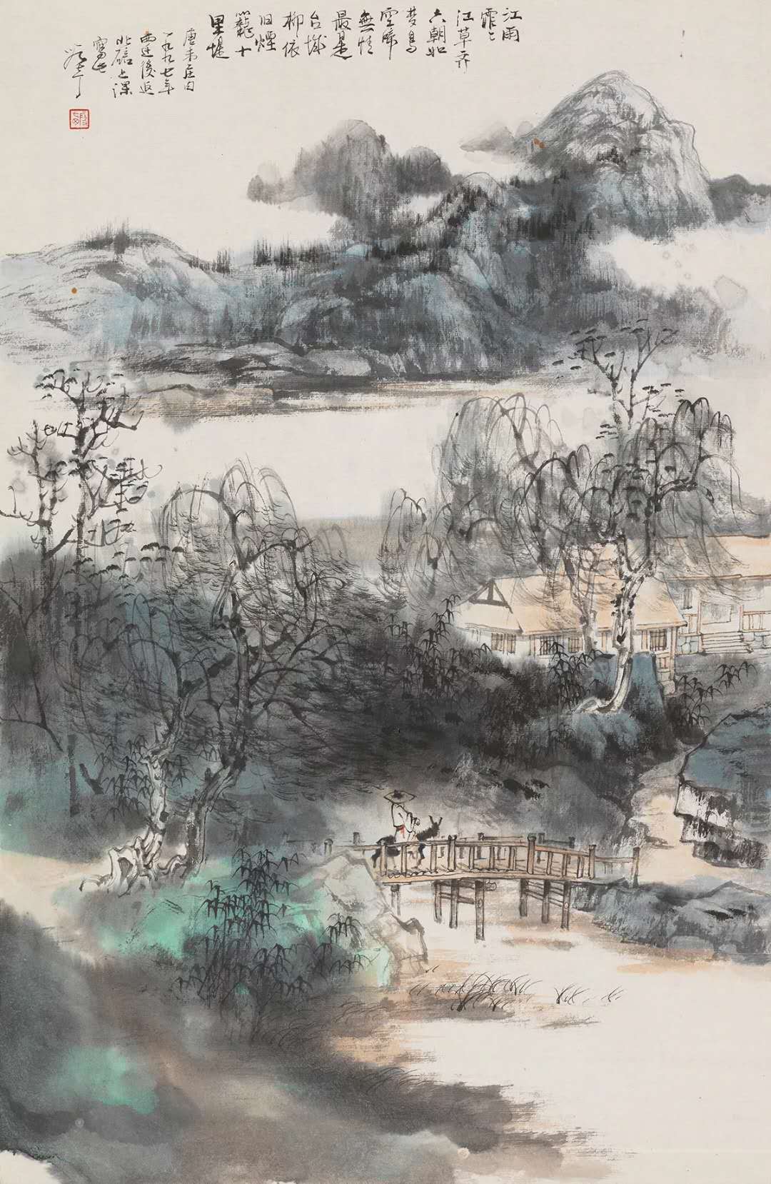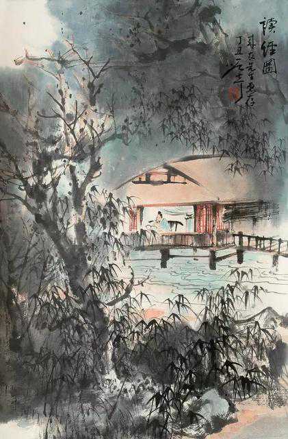 七丁绘画取材一般不大。他往往截取自然的半边一角,一堵门墙,一泓清潭,一片农舍,一座小丘,或者老柏两三树,渔舟一两只,而着意玩味其意趣:小镇的闲适,夜语的呢喃,溪声之淙淙,月归之静谧,画家善于在普通而平凡的生活中找到浓郁的诗情。在他的山水画中,正是那些点景似的小小人物,却画龙点睛似地让平凡的似乎简单的景致升华到诗的境界,在走路、理发、读书、捕鱼、晾晒、洗衣等日常生活场景里使小情小景的山水画平添出若干亲切与温馨。这种对四川农村随处可见的普通场景的表现,构成了七丁艺术平淡天真的独特的风貌。