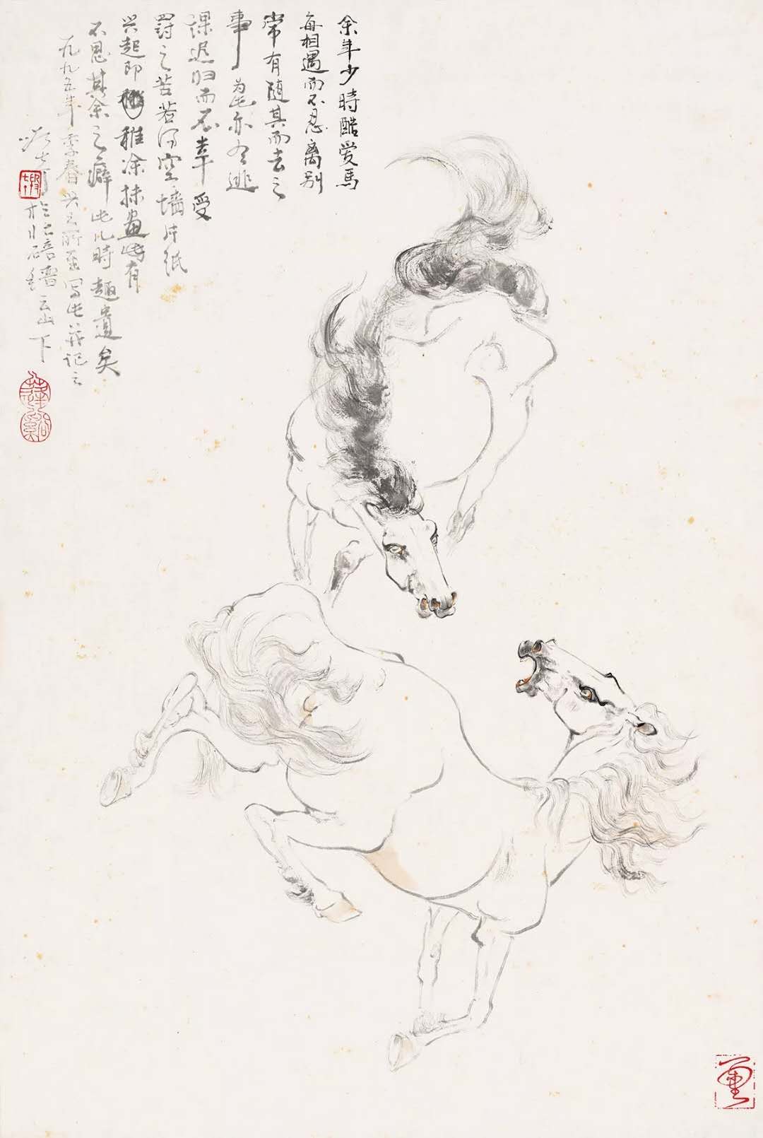 款识:余年少时酷爱马,每相遇而不忍离别,常有随其而去之事。为此,亦有逃课迟归而不幸受罚之苦。若得空墙片纸,兴起即稚涂抹画,有不思其余之癖。此儿时趣遗矣。一九九五年季春兴之所至写此并记之。段七丁柃北碚溍云山下。