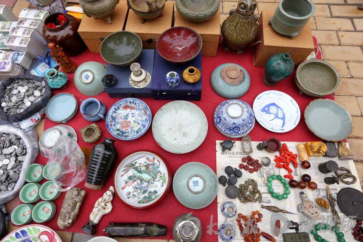 从西门入口处进入,远远望去,街区两侧熙熙攘攘,各式各样的文玩产品琳琅满目,异彩纷呈。既有常见的青铜器、瓷器、玉器、书画,也有充满怀旧色彩的古家具配件、老物件藏品等,可谓包罗万象、应有尽有,可以满足不同收藏爱好者的寻宝需求。