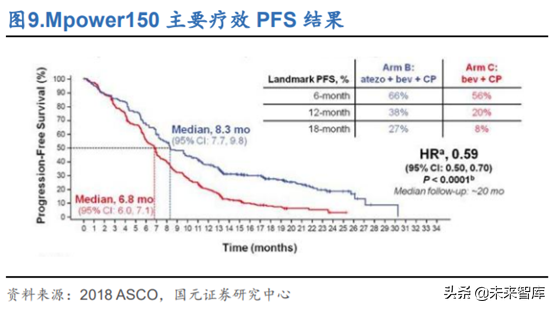 此外,罗氏的PD-L1+贝伐+化疗(紫杉醇+卡铂)三联方案也获批非鳞NSCLC一线治疗。罗氏的Mpower150是一项多中心、开放性、随机、对照III期临床研究,评估Atezolizumab+化疗(卡铂和紫杉醇)联合或不联合贝伐珠单抗治疗初治晚期非鳞NSCLC的疗效和安全性,共入组1202例患者,结果表明三联方案可以显著延长患者的中位PFS和OS。但三联方案昂贵的治疗费用和较大的副作用可能限制其临床应用。