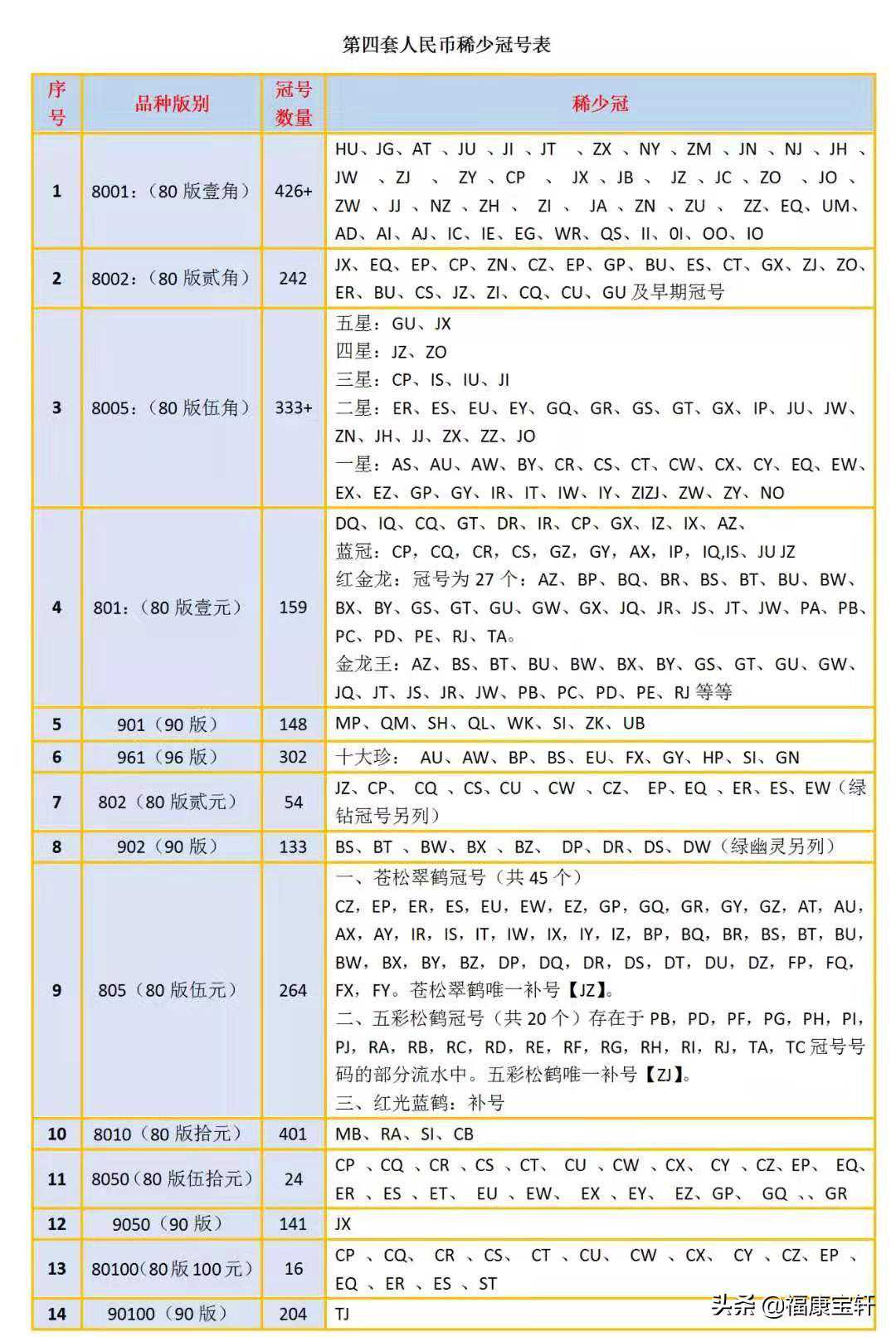 每种面额冠号众多,在其收藏投资同一品种,冠号的稀少也是影响价值的。比如同样是绿钻荧光币品种,同样的品相,补号的绿钻相应要比普通冠的绿钻价值高。“物以希为贵”是钱币收藏的黄金定律。下面我概括汇总了一下第四套人民币的稀少冠、冠补号、首发冠、开门冠、数字冠给大家参考一下。希望能够帮到你更了解我们青春那个最佳小伙伴!