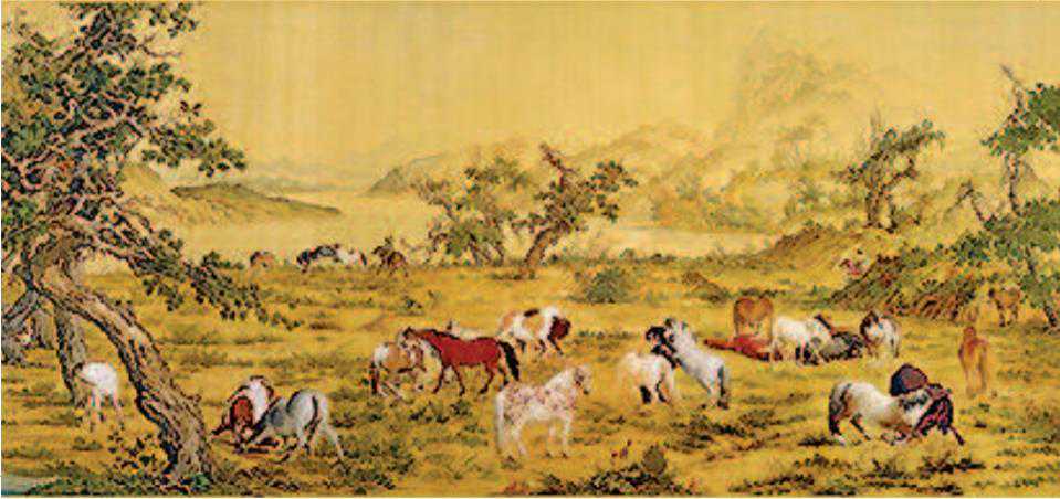 到了清朝,又出现一件极具舶来文化特色的制作在丝绸上的作品——清代画家郎世宁的《百骏图》。郎世宁是意大利人,出生在文艺复兴的中心米兰。1715年,27岁的郎世宁沿着海上丝绸之路来到中国,成为清朝宫廷的一位画家。雍正二年,郎世宁受命绘画《百骏图》,这是一幅融合了中西方绘画技艺手法的作品,整体上以中国山水画的风格为主,画中的山水树木使用的是典型的中国绘画中皴擦的传统笔法;但是具体到每匹马身上又采用了西方透视绘画法,呈现出很强的立体效果。最终郎世宁在一幅高度0.94米、宽度7.76米的丝绸上画出了一百匹骏马——被称为“中国十大传世名画”之一的《百骏图》诞生了。