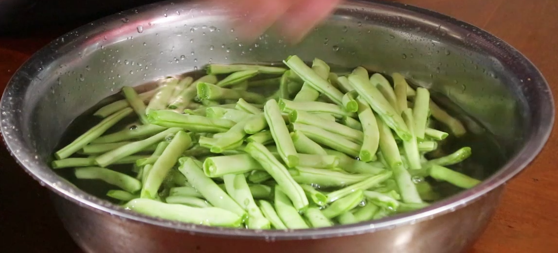 2、把四季豆的老茎撕掉,再折成两半就可以了,长点没关系,清洗的时候放点盐泡一下,这样能有效的去除农药的残渍,这些是自己家种的,没有打药洗几遍就好了。