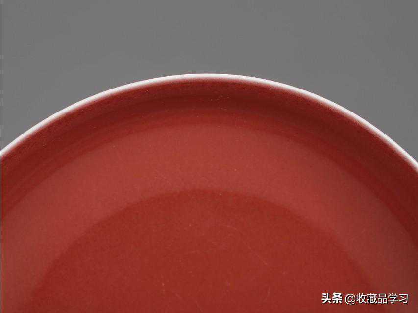 盘造型端庄周正,胎质细滑。内外壁施霁红釉,釉色凝厚莹亮。盘口沿处色浅,呈白色,形成“灯草口”之效果,对比鲜明,饶有意趣。圈足修削工整,无聚釉垂流之患,底为白釉。