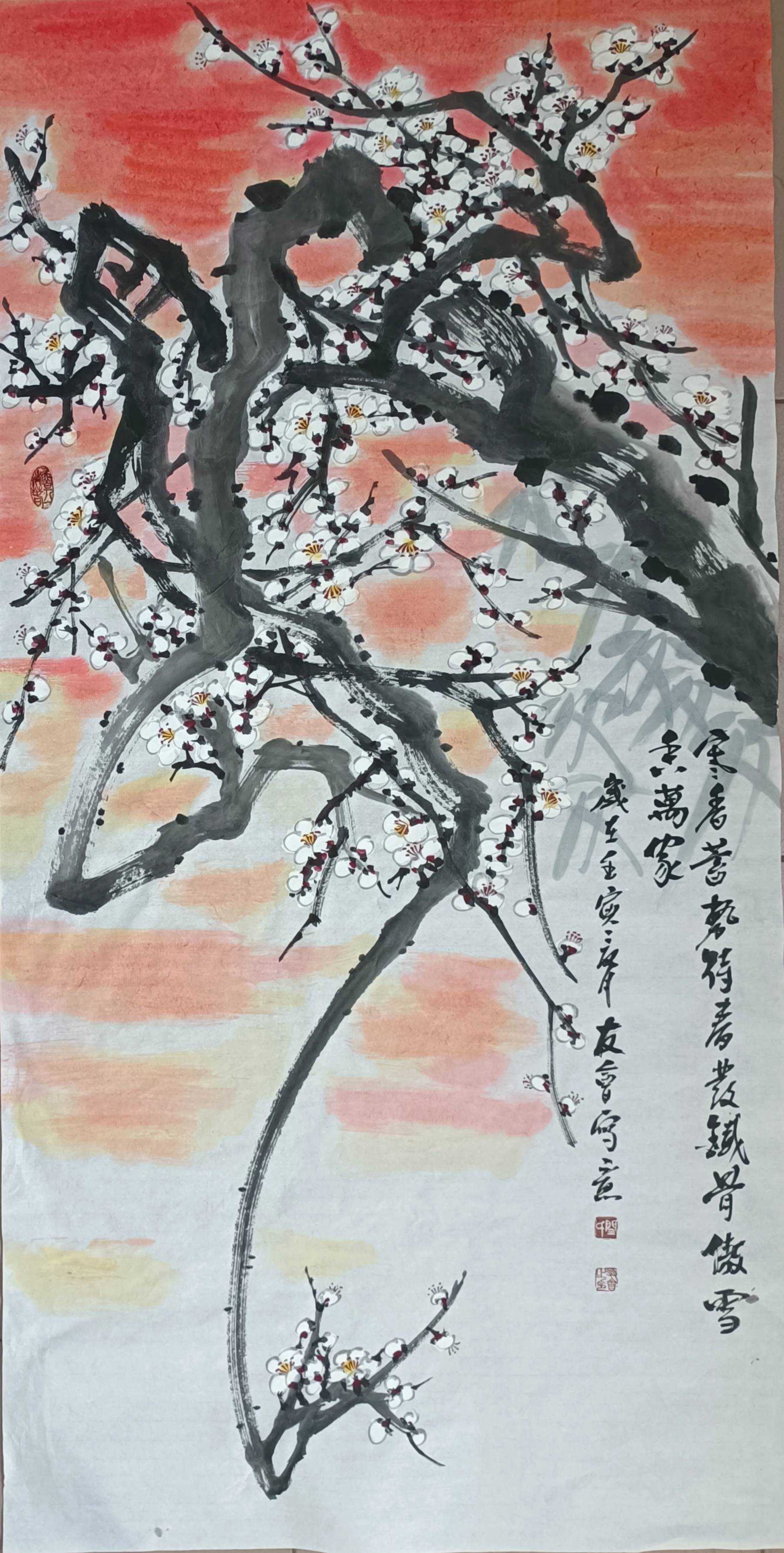 他笔下梅花经由皴擦勾勒,浓点淡抹,既展示了五墨六彩的艺术效果,又画出了梅花粗干老干的蒼劲和细技嫩枝的挺拔,配上揉搓有致的各色梅花,就形成了他梅花作品的鲜明生动、雅俗共赏的风格特!一枝矗向云霄去,万点梅花逸风情。这样的龙骨梅花,尽见中国画的气韵生动,也是骨法用笔、应物象形的经典。挂一件在厅堂必然赏心悦目,蓬荜生辉,可以突跃出令人大振心颜的磅礴气象。龙梅第一笔,功到自然成!中国画讲究外师造化中得心源!闫友会习成画道,除了向古法学习之外,还特别重视取法自然。