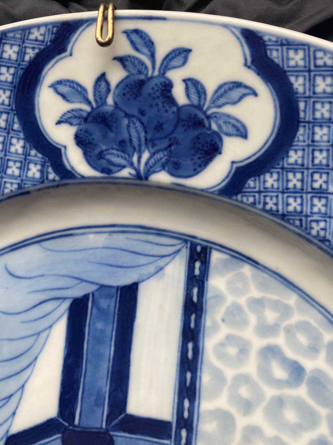 答:藏友您好!从您发来图片看,此件青花人物花果盘首先从背部挂钩看就已经把盘子的用途改变成了一种装饰品,这也是近些年回流瓷经常看到的装饰手法。