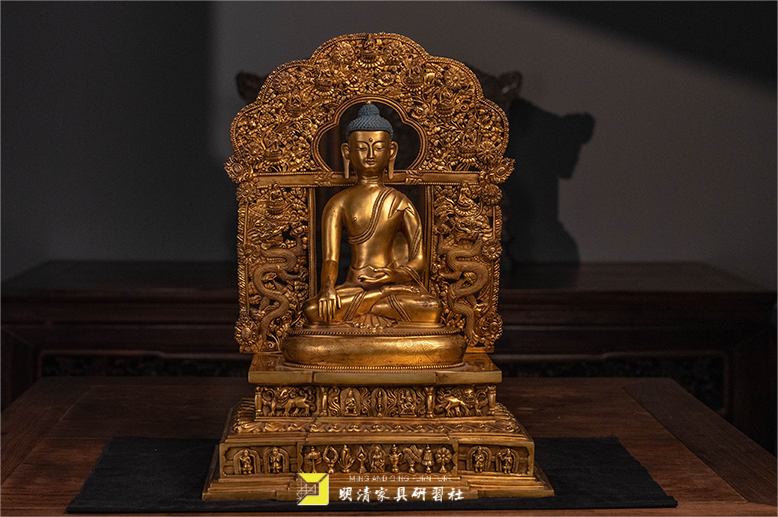 清铜鎏金释迦摩尼佛像配须弥座及背光研习社珍藏