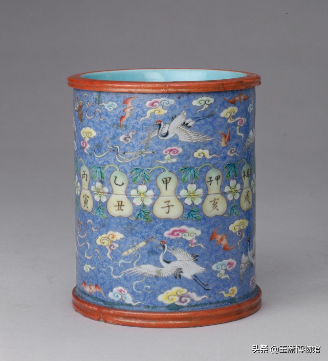 清乾隆天蓝地轧道粉彩暗八仙云鹤图篆字笔筒天蓝地轧道粉彩暗八仙云鹤图篆字笔筒北京故宫博物院藏