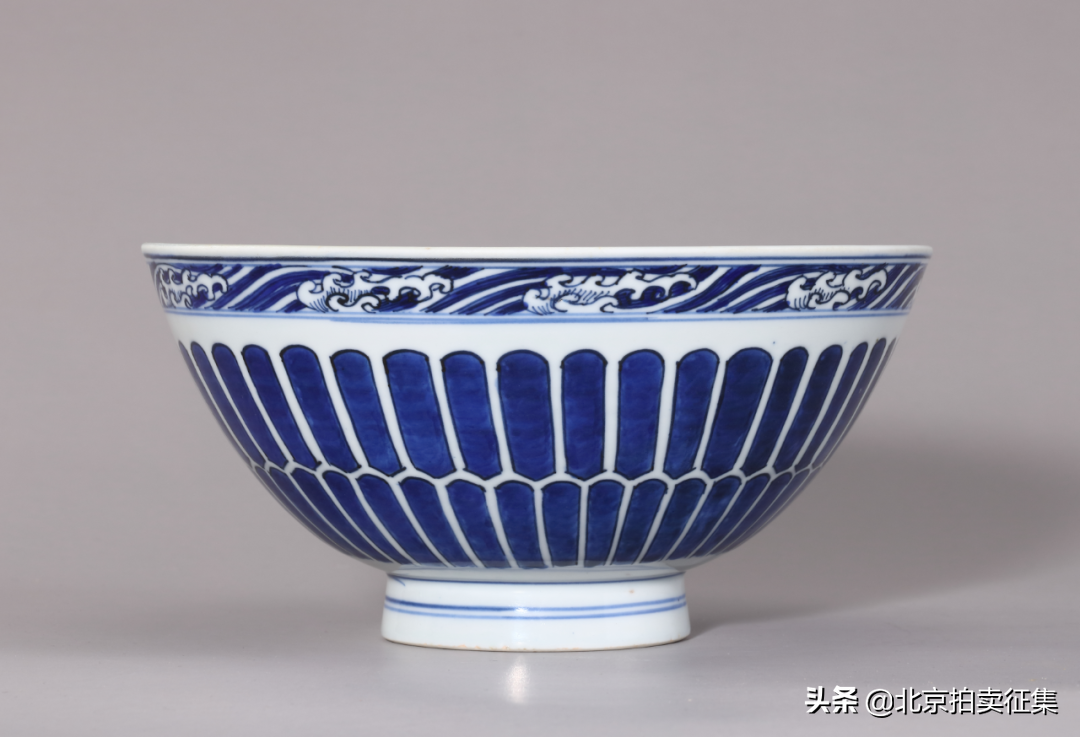 明万历仿宣窑青花外莲瓣纹内缠枝花卉纹碗