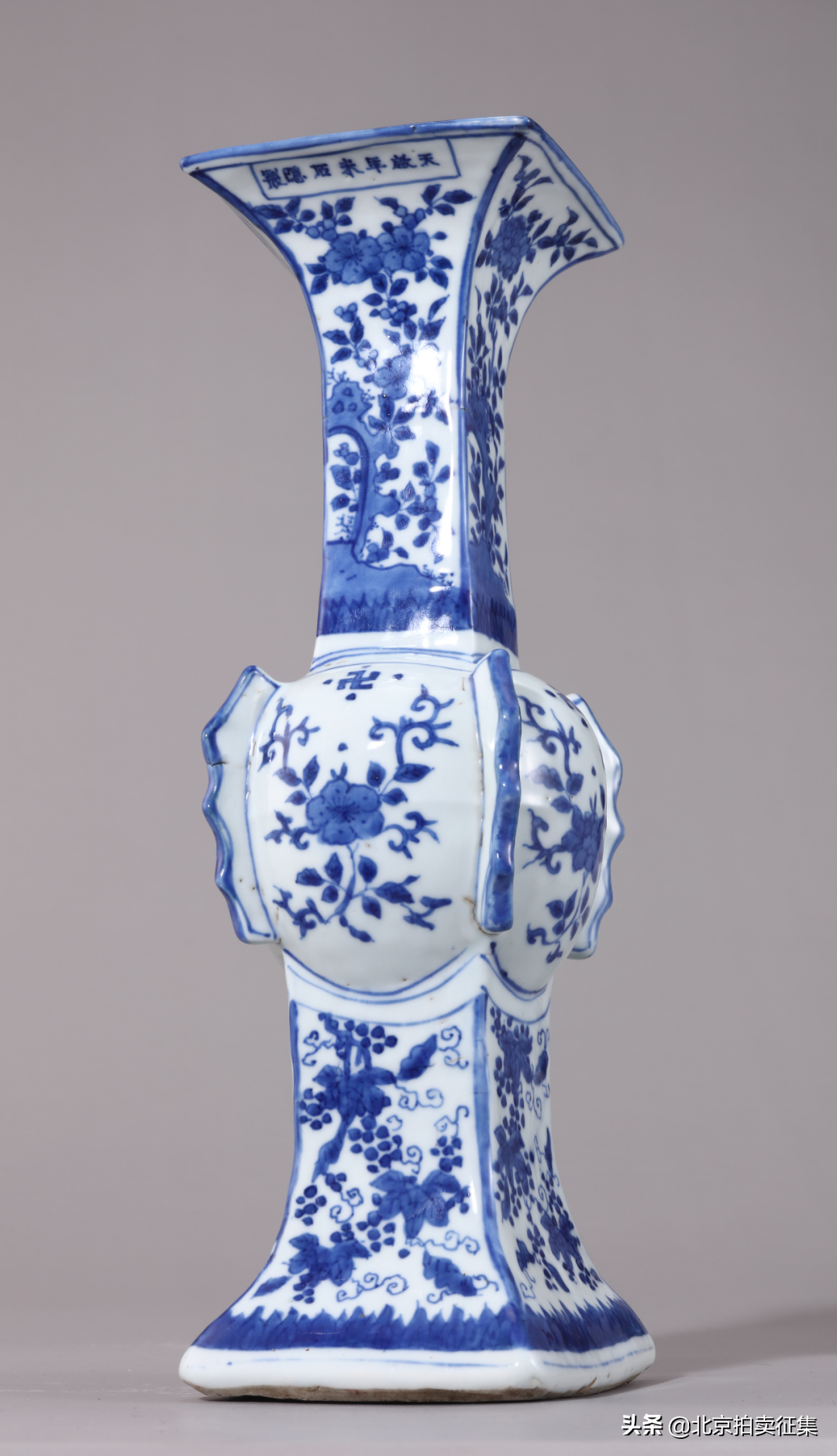 清三代皇帝尤爱古器物,所以仿古器物的烧造一直流行于清廷,青花仿古瓷也不例外。在宫廷《记事档》中有多处记载仿器物的青花瓷器的烧造情况,如记载之“仿宣窑”、“仿成窑”、“仿嘉窑”品种等。清代自康熙朝始,皇帝多次传旨令御窑厂以明宣德青花为楷模,精心仿制,即所谓的“官仿官”。由于用的是云南产的珠明料,故绘画时采用点染技法追慕苏麻离青之铁锈斑效果。另有一部分仿烧器,纹样灵感虽源自明朝,但绘画则有明显区别,带有清官窑的韵味,体现了两朝审美之区别。