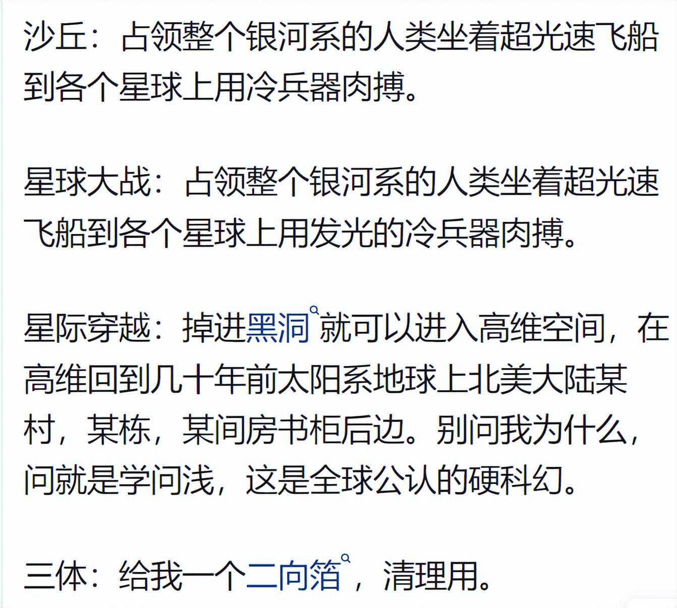 三体三部曲里的文明之间的战争才是宇宙战争该有的级别。人家都超光速怼你脸上了,居然跟你玩枪战。这种情节在《三体》出来之后,就显得极为幼稚了。看到黑暗森林,逃亡舰队在内讧之前的那一段,真的是惊心动魄,深深感觉大刘简直是挥金如土,如果浪费是罪,那大刘简直罪大恶极,这种文明剧变的情节,大刘只用了很短的篇幅就写完了,完全可以扩充很多万字的。超过理解的事物就是套娃了,无非换了一个名词,可以理解的情况下面对那种无力感才是真的绝望,这种绝望带来的思维震撼是享受级的。