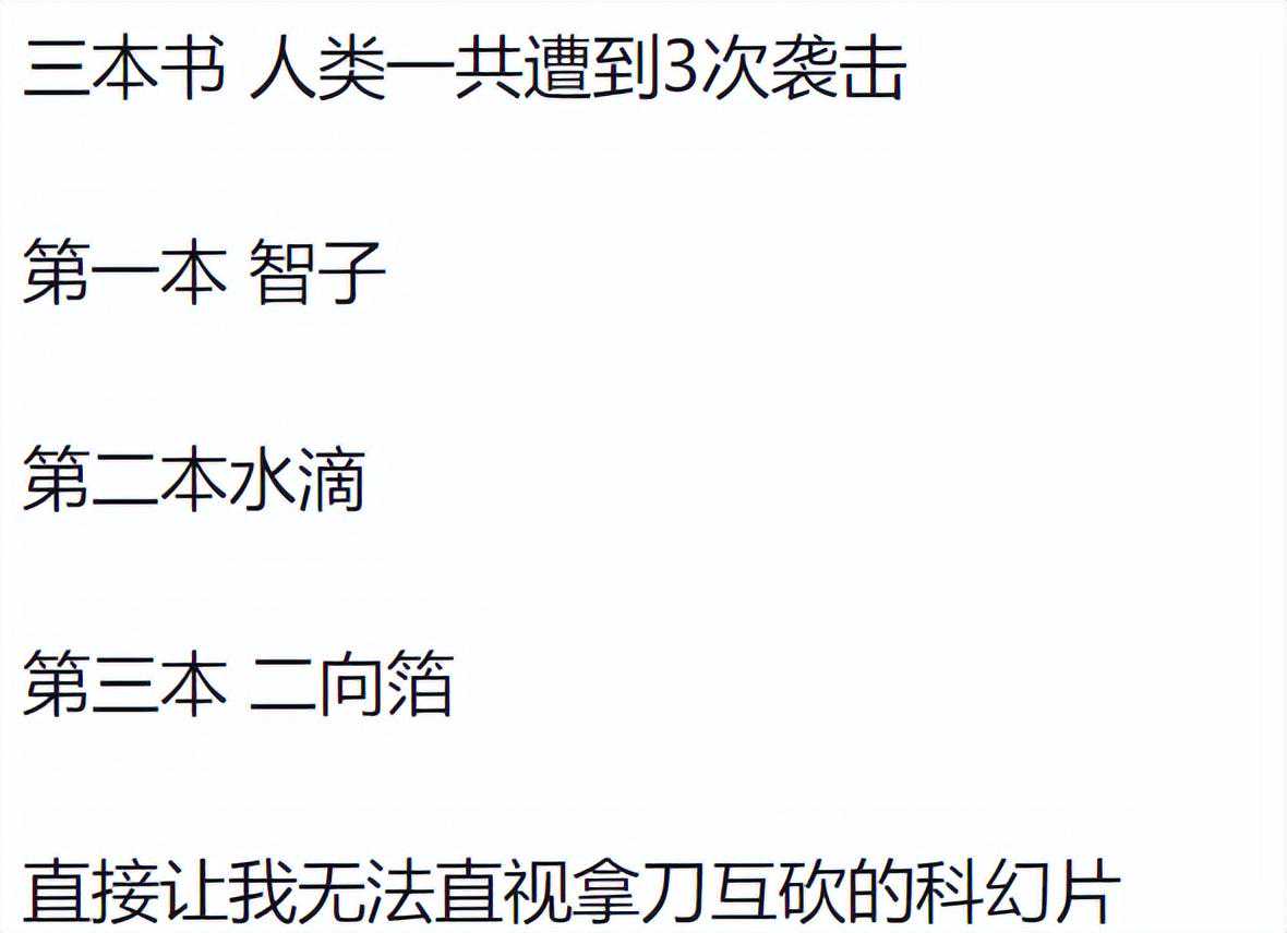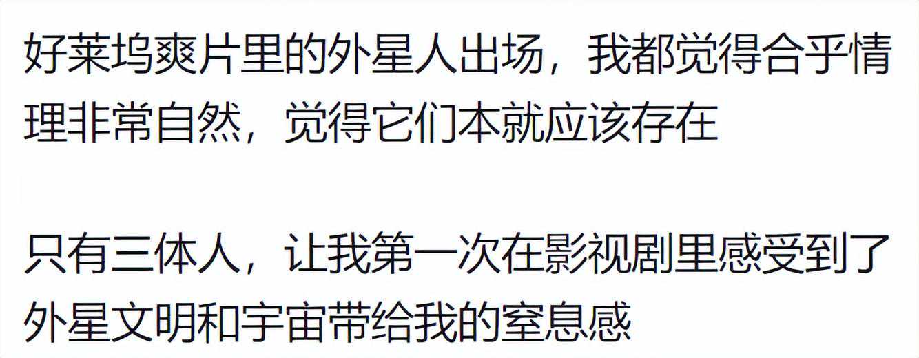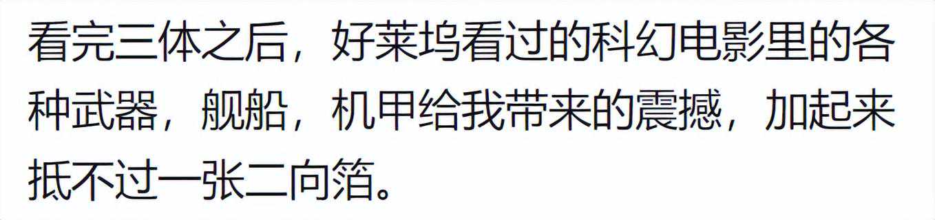 这么说吧,三体小说,直接摧毁了好莱坞式大片的影响。从根本上否定了美式科幻大片大场面的意义说实话,我看到水滴的时候,西方的科幻在我眼里就是下乘了,原来还有如此朴实无华的星际级武器。二向箔什么的往后稍稍。我看完第一部感觉是不错顶级水准,看完第二部是震撼+舒服像喝酒喝到微醺,看完第三部感觉是难过为自己的渺小悲哀。这得感谢误诊大刘的医生,让大刘误以为自己命不久矣,有多少存货不赶紧抖落干净怕要带进棺材了,写完了发现误诊,悔之晚以前看各种科幻小说科幻影视,我都觉得很合情合理,把外星人换成其他国家剧情也成立,只有三体,才让我觉得这才是真的外星人都看到这儿了