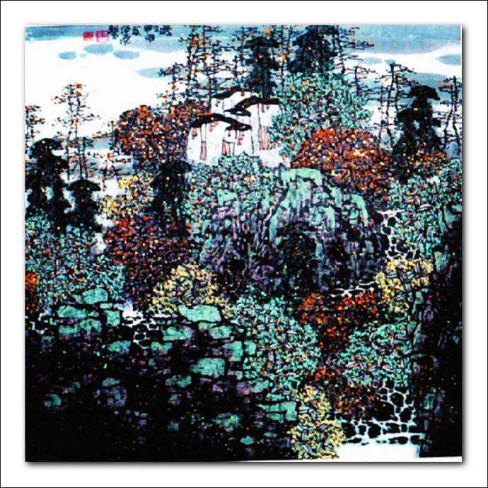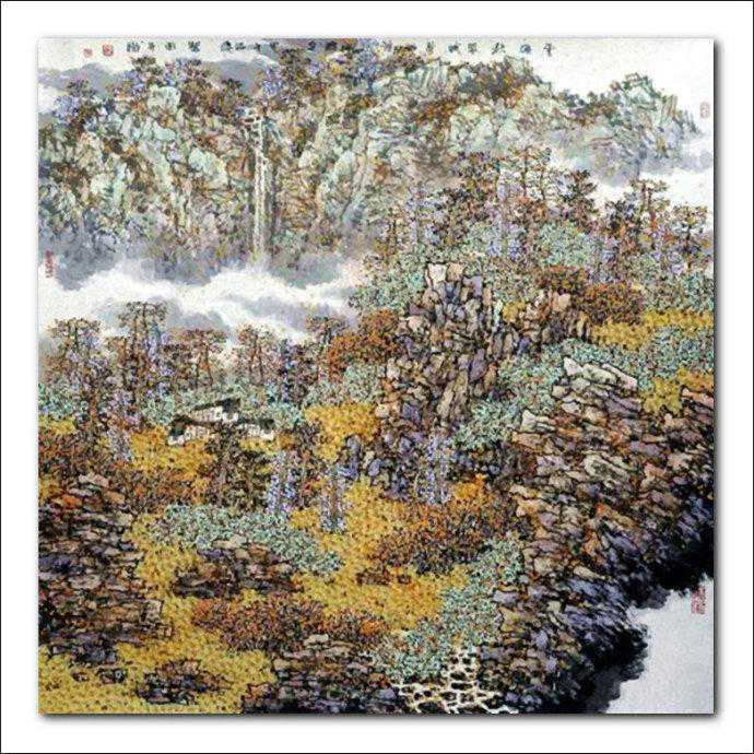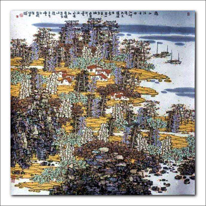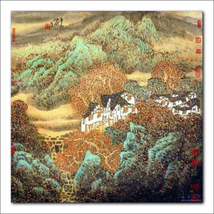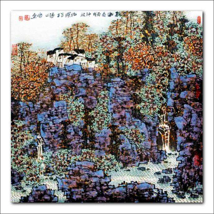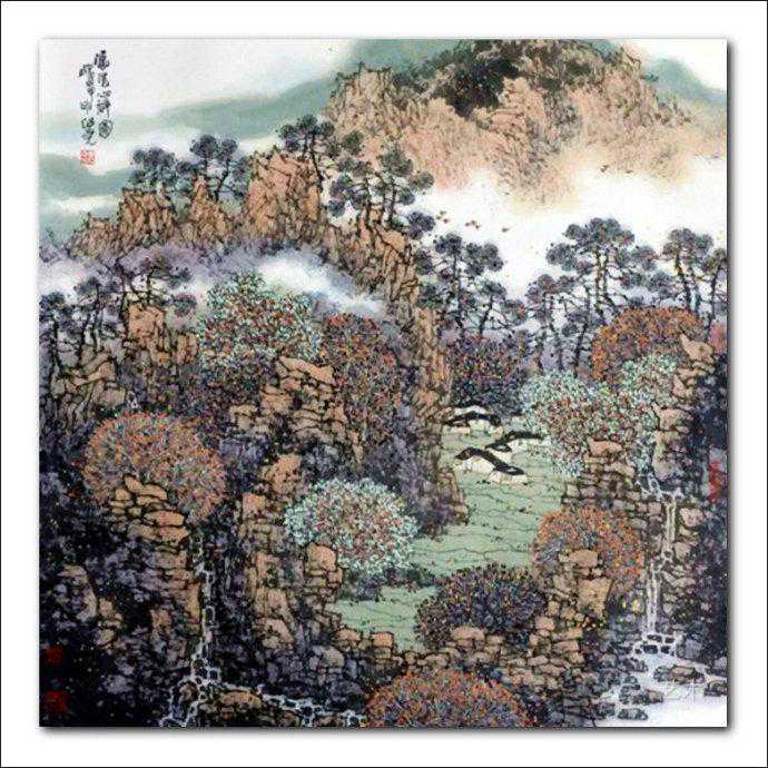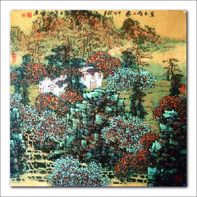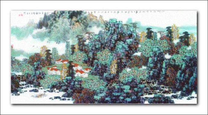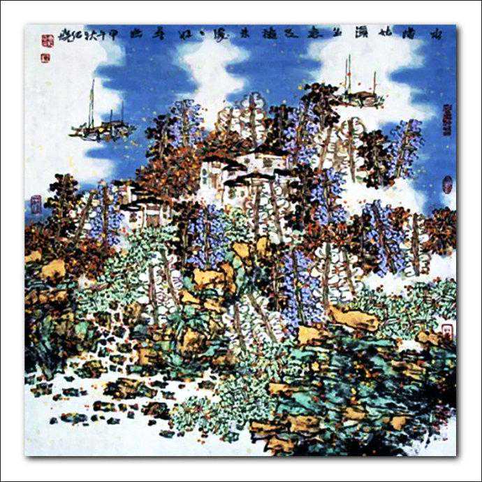 唐绍尧的作品构图饱满、繁而不乱、线条流畅、色彩浓郁、雅俗相融、意境深远、别具一格,具有强烈的形式感和装饰美。唐绍尧的作品不仅拥有传统笔墨语言的老辣遒劲、落笔大气的艺术感觉,在创作的形式上还有以下突破:一是重彩山水形式加入了图案的装饰效果,作品既有古朴的传统文化感,又洋溢着轻松明朗的时代气息。二是不拘于固有的程式定法,在技法上不但摆脱了南派山水的阴柔与纤弱,而且以不同的情境表现引入主体情感进行体味与悟道。三是“诗”的元素在主体与客体间形成了一种紧密的情感联系,作品把具体的物象变为诗的元素,从而产生由诗化构成的意境美,在诗如画,画如诗的意境中,以诗与景的紧密结合,呈现出一种生命勃发的焕然生机。