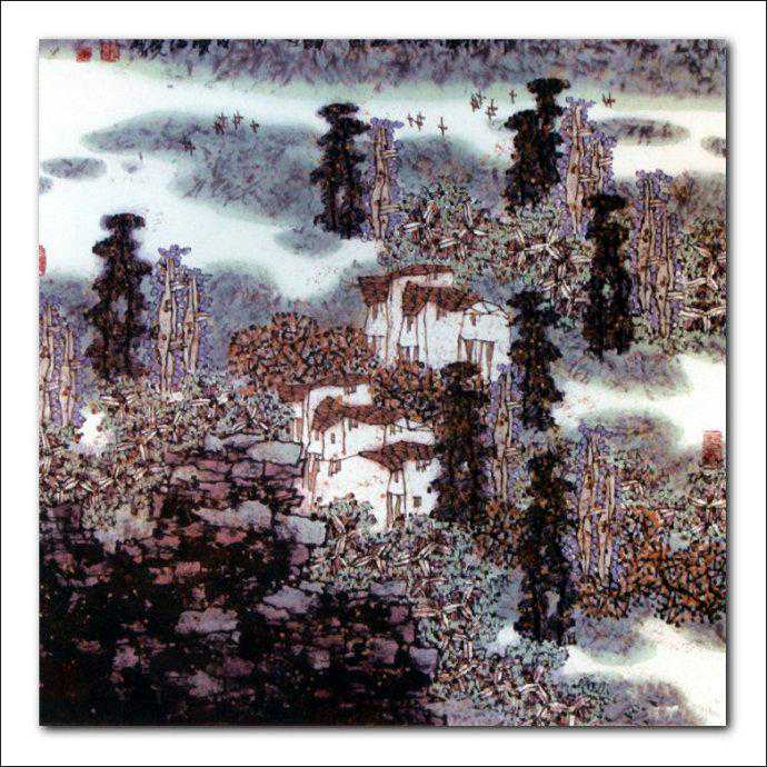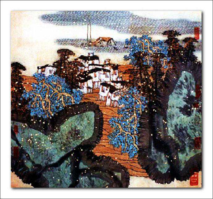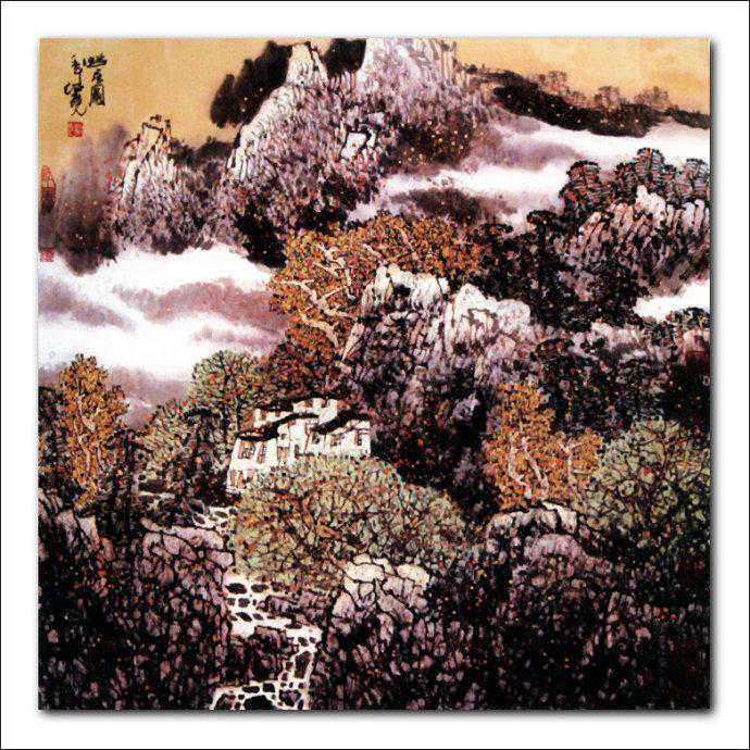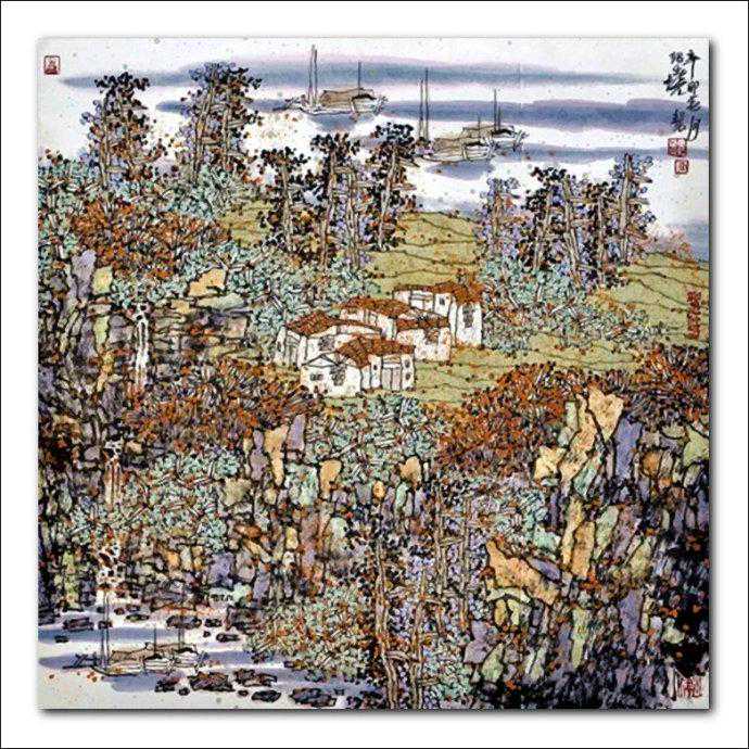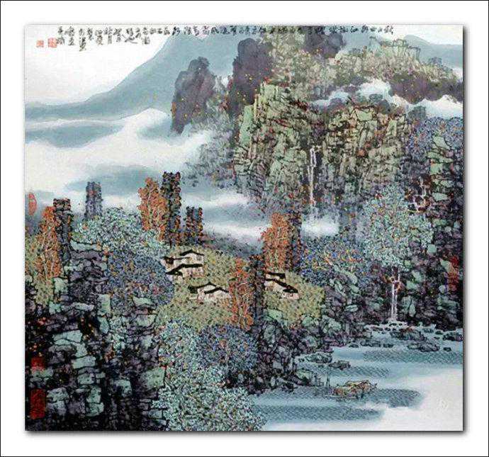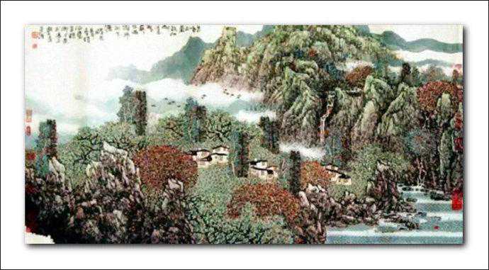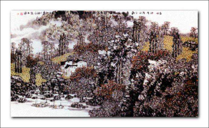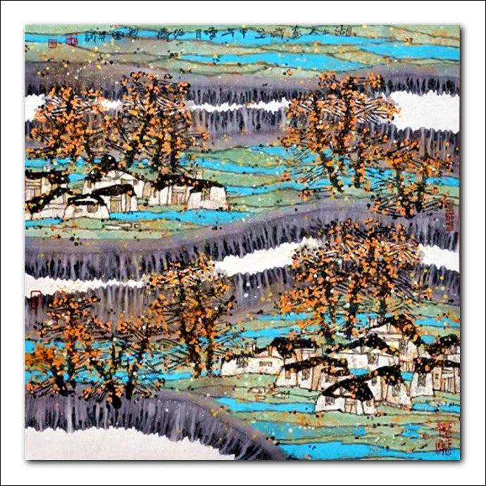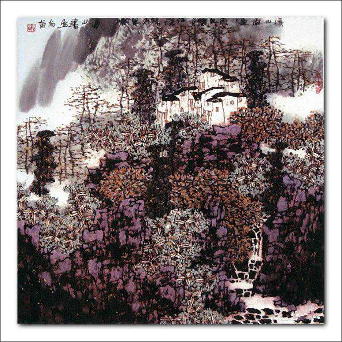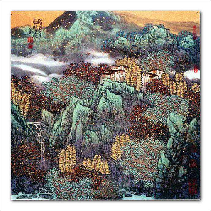 唐绍尧的作品构图饱满、繁而不乱、线条流畅、色彩浓郁、雅俗相融、意境深远、别具一格,具有强烈的形式感和装饰美。唐绍尧的作品不仅拥有传统笔墨语言的老辣遒劲、落笔大气的艺术感觉,在创作的形式上还有以下突破:一是重彩山水形式加入了图案的装饰效果,作品既有古朴的传统文化感,又洋溢着轻松明朗的时代气息。二是不拘于固有的程式定法,在技法上不但摆脱了南派山水的阴柔与纤弱,而且以不同的情境表现引入主体情感进行体味与悟道。三是“诗”的元素在主体与客体间形成了一种紧密的情感联系,作品把具体的物象变为诗的元素,从而产生由诗化构成的意境美,在诗如画,画如诗的意境中,以诗与景的紧密结合,呈现出一种生命勃发的焕然生机。