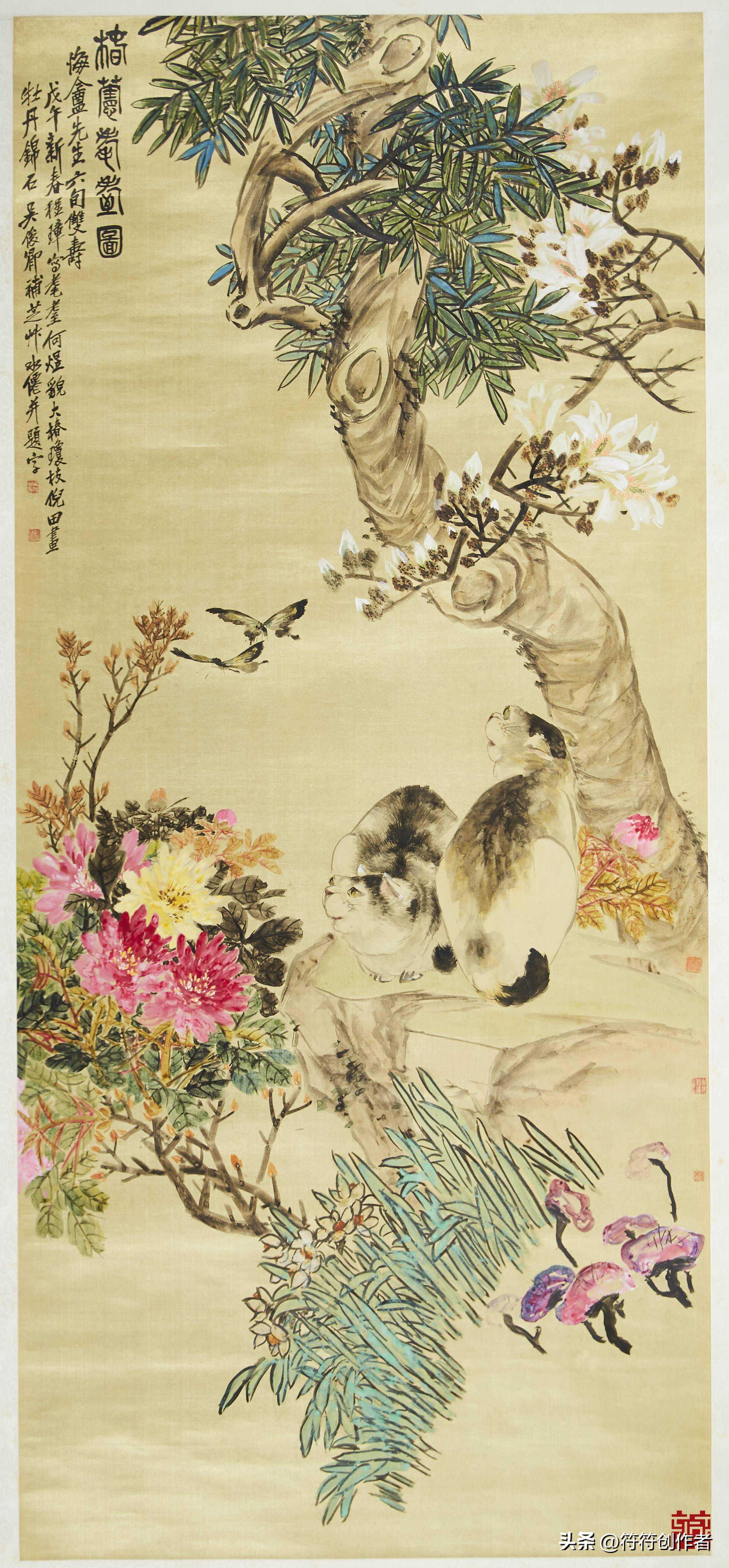 我们来看看吴昌硕这幅可爱的猫拍蝴蝶的现代画。