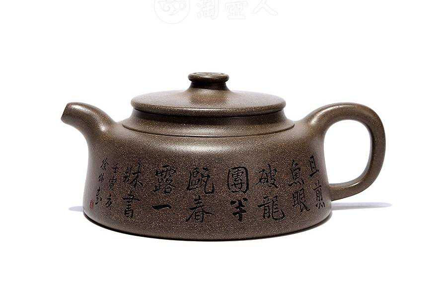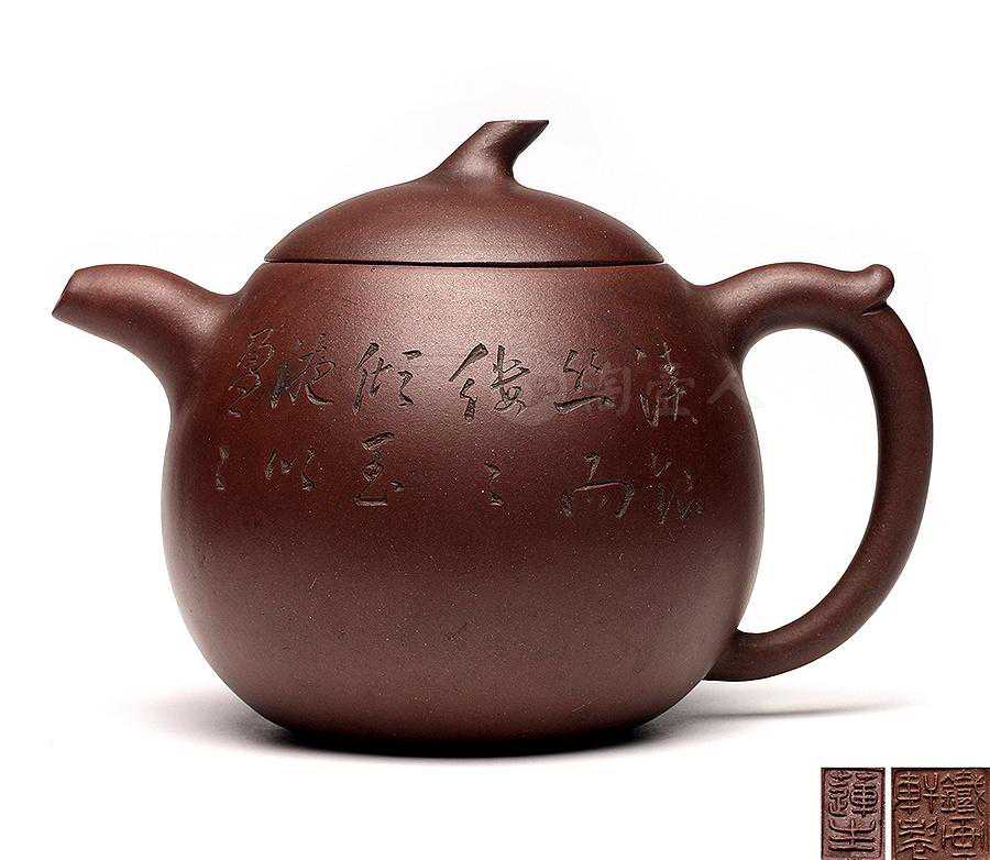 此壶集诗、书、铭于一体,正面腹部刻行书“待枪旗而采摘,对鼎历以吹嘘”,寥寥数笔,茶的色、香、味与紫砂器融为一体,极富意趣。