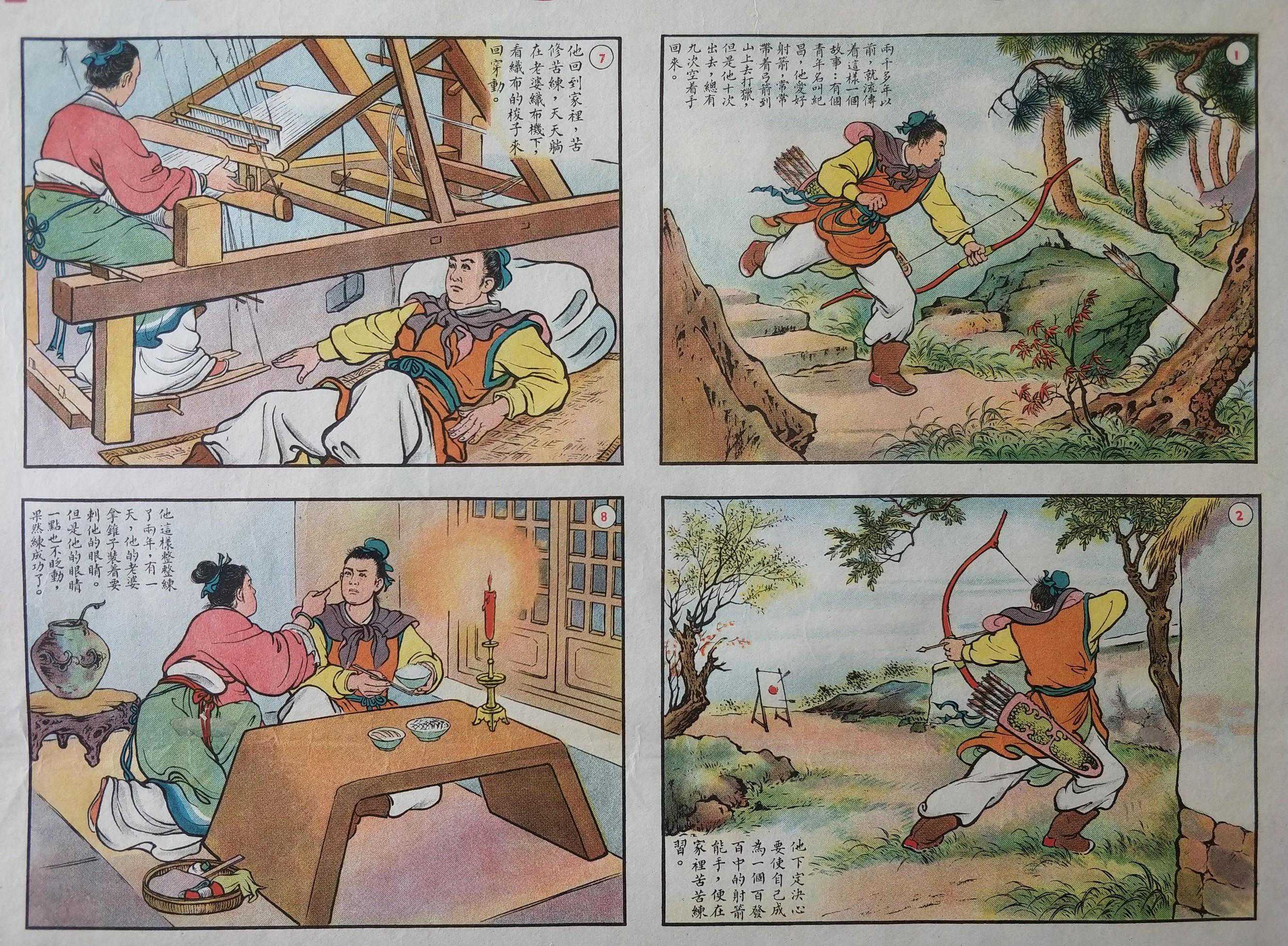 纪昌学箭的故事以四条屏的形式呈现,其中每一幅小图如果单独裁剪出来,就是一本精美的连环画。有趣的是,许多年画加个标题可以直接拿去做连环画封面,多格故事型年画本身就是一本展开的连环画,这两种艺术很多时候差别并不大,只是装帧尺寸的差异。