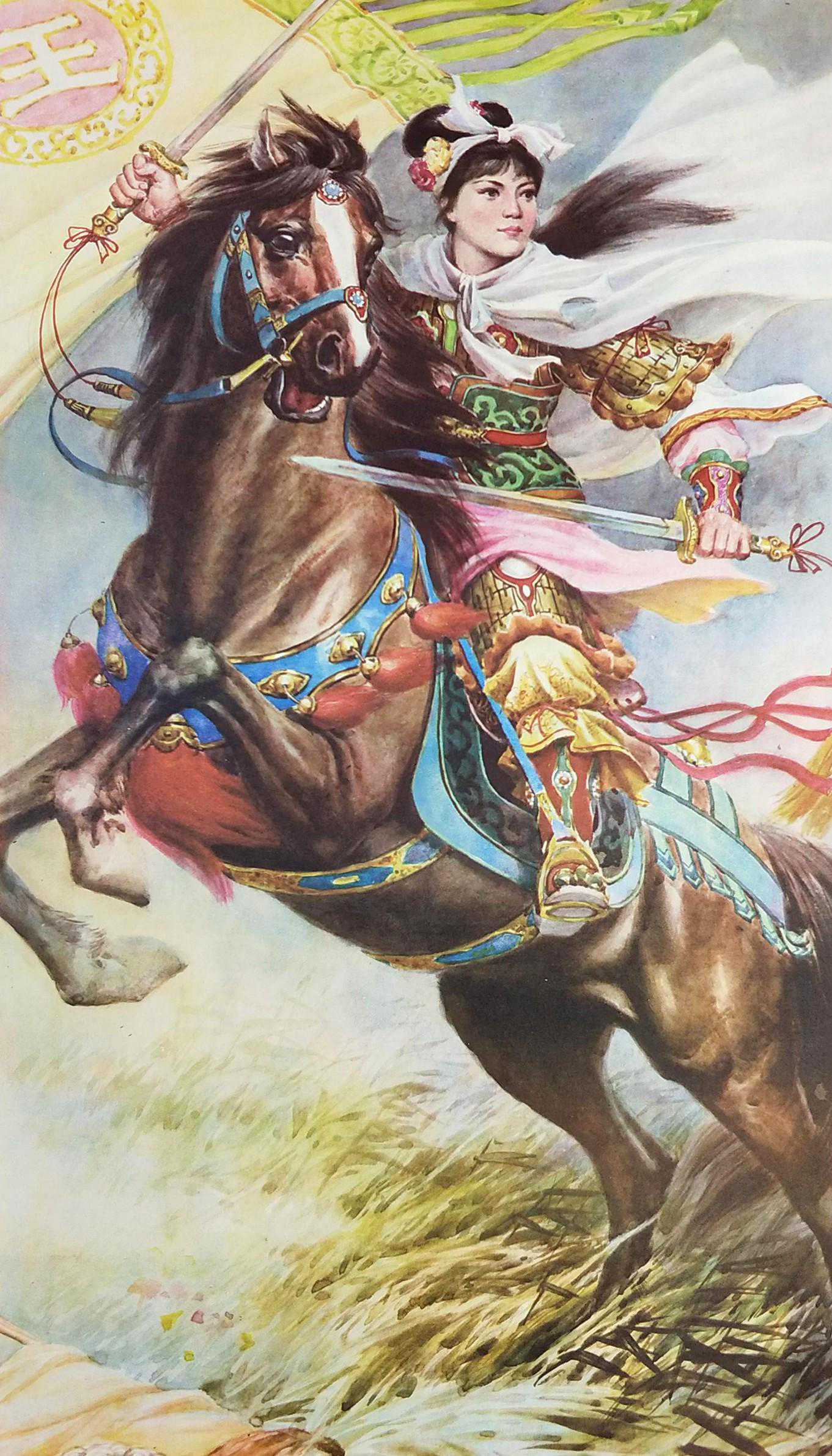 清代白莲教首领王聪儿,白色披风黄金甲,英姿飒爽,这种画法其实在民国时期基本没有,还是建国后的画法,我猜测是油画与水彩画混合的产物。