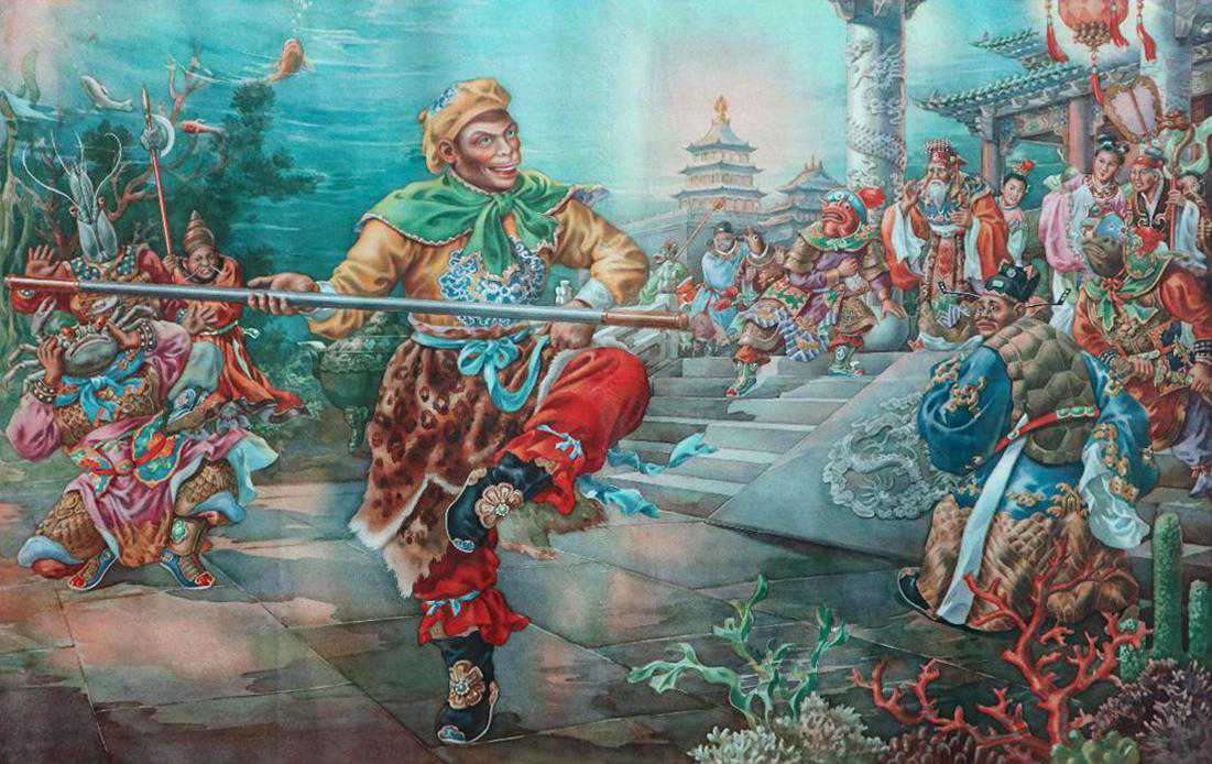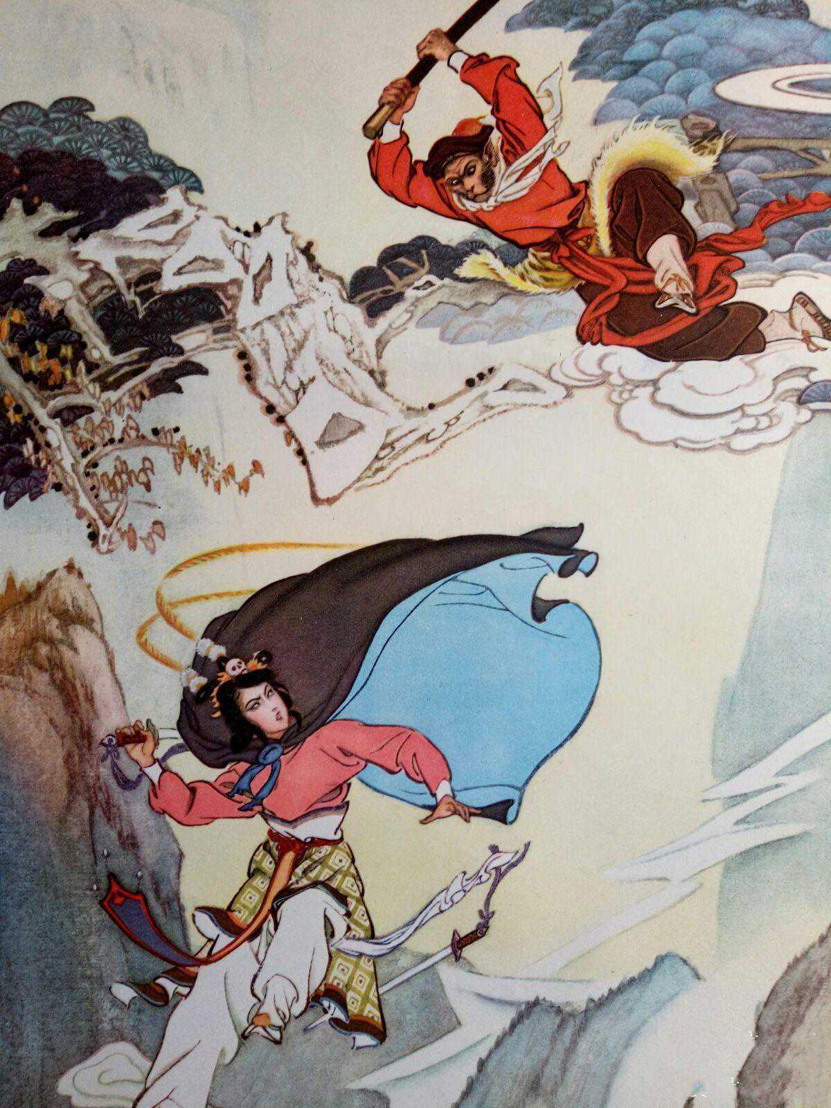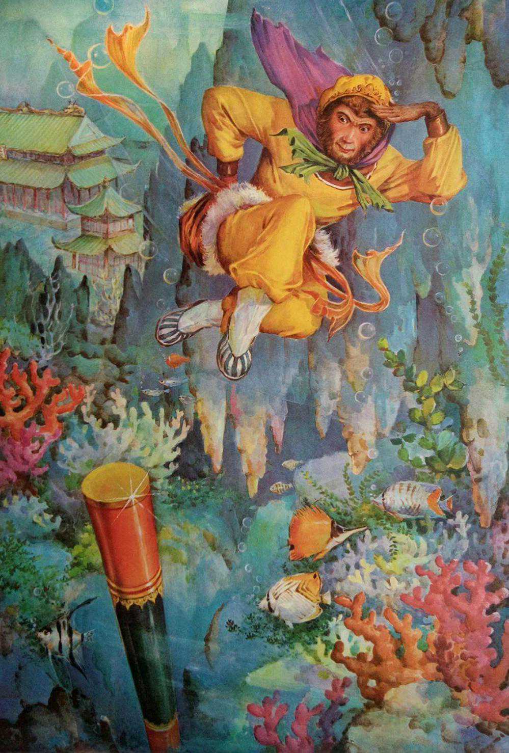 龙宫探宝,悟空居然能看到热带鱼,这是老年画的特色,那时候对彩色海底认识还是来自国外的海底照片,画家直接就临摹了些热带鱼进去。