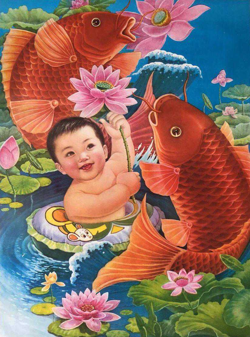年画上男孩儿比女孩儿多,在房价不高的年代,多子多福是大家心中的信念,而连年有余的寓意让鲤鱼成了年画的重要嘉宾:男娃娃或者骑着鲤鱼,或者抱着,或者是钓起,总之,娃娃各种花样戏鲤鱼,鲤鱼体型普遍比娃娃要大,这类年画屡见不鲜。