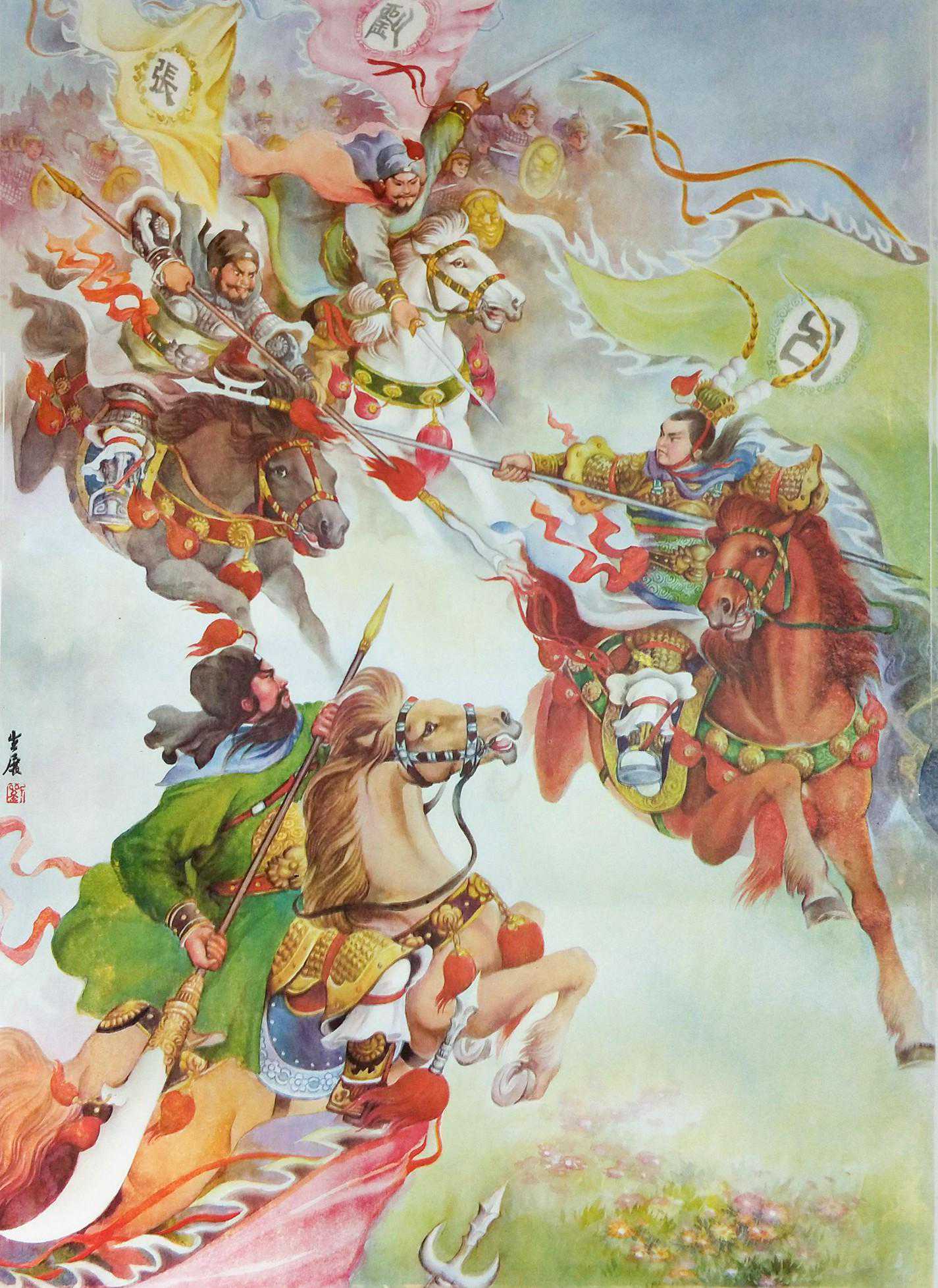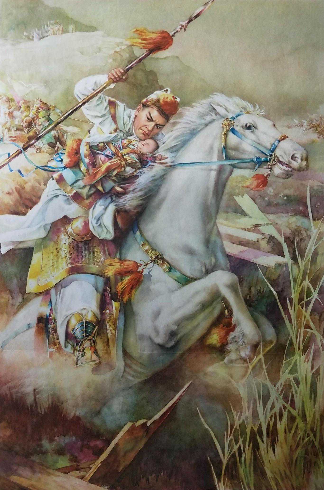 这幅长坂坡的绘者金雪尘是新中国年画八大家之一,他能够把西方水彩与中国传统写意结合,营造出温馨的画面氛围。他与李慕白合作了很多精品年画。这里赵子龙与阿斗的聚焦点非常清晰,而其他外围景色就做了一些虚化处理,这与照相的原理相通。