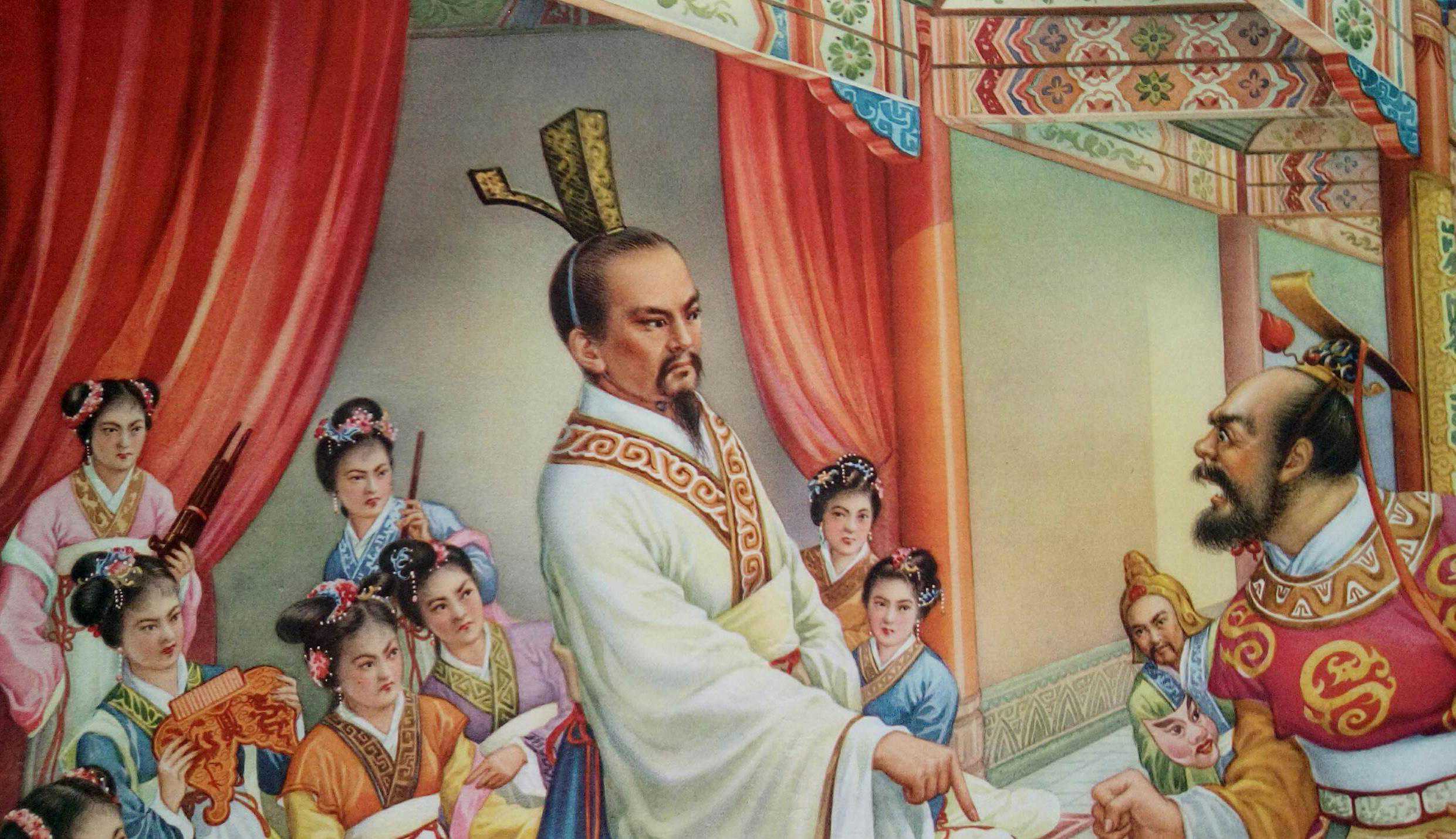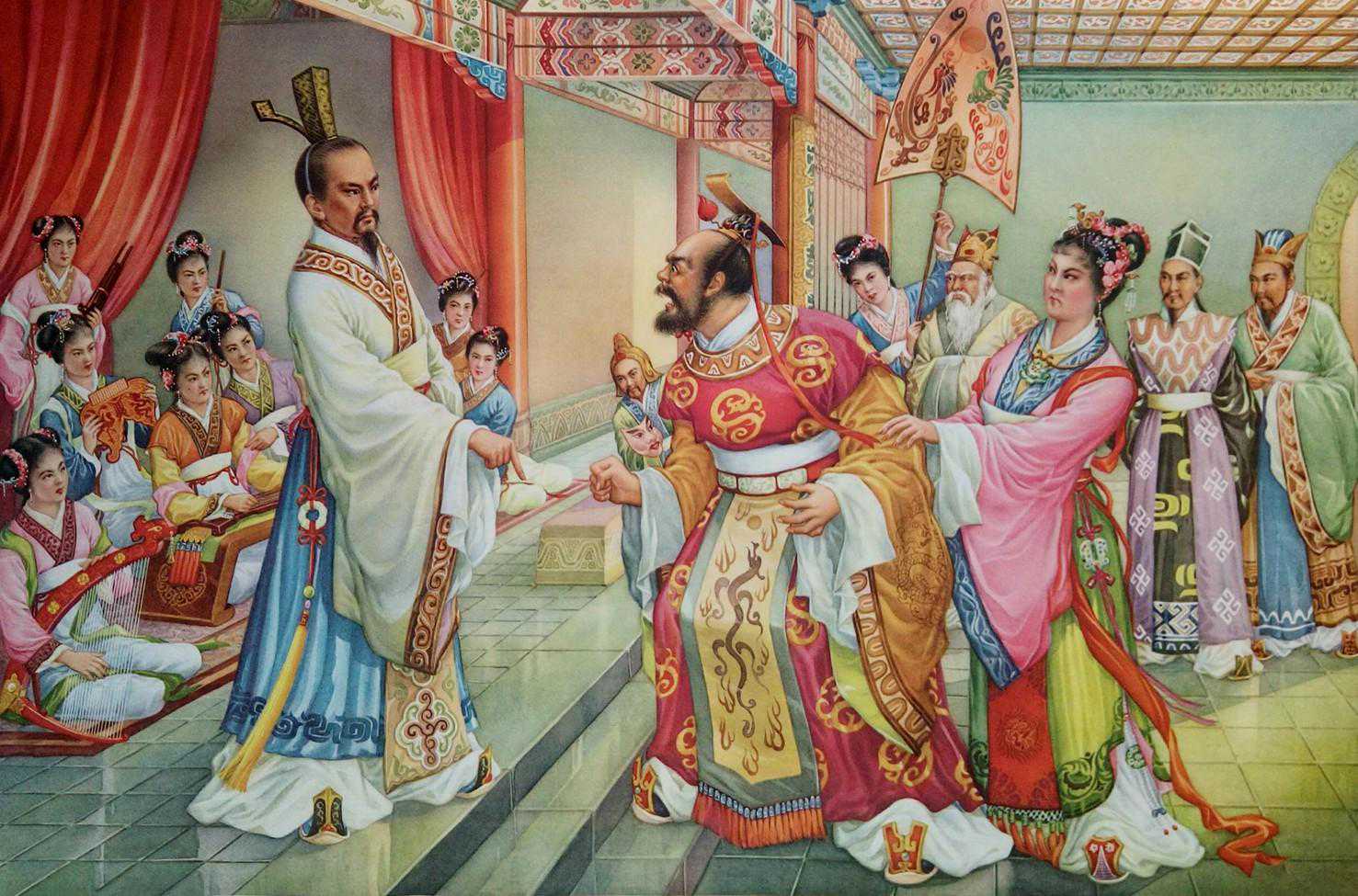 屈原出使过齐国,但齐国国君对他不错,只有那个楚怀王是与屈原相爱相杀的,所以我判断年画中的皇帝是楚怀王。屈原站在台阶上挺直身躯,楚王立于阶下愤怒失态,弯腰屈膝。两个人形象谁高谁低立判。地砖还画出来倒影,显得格外光滑。整幅画的色调搭配极其养眼,真的做到了艳而不俗。