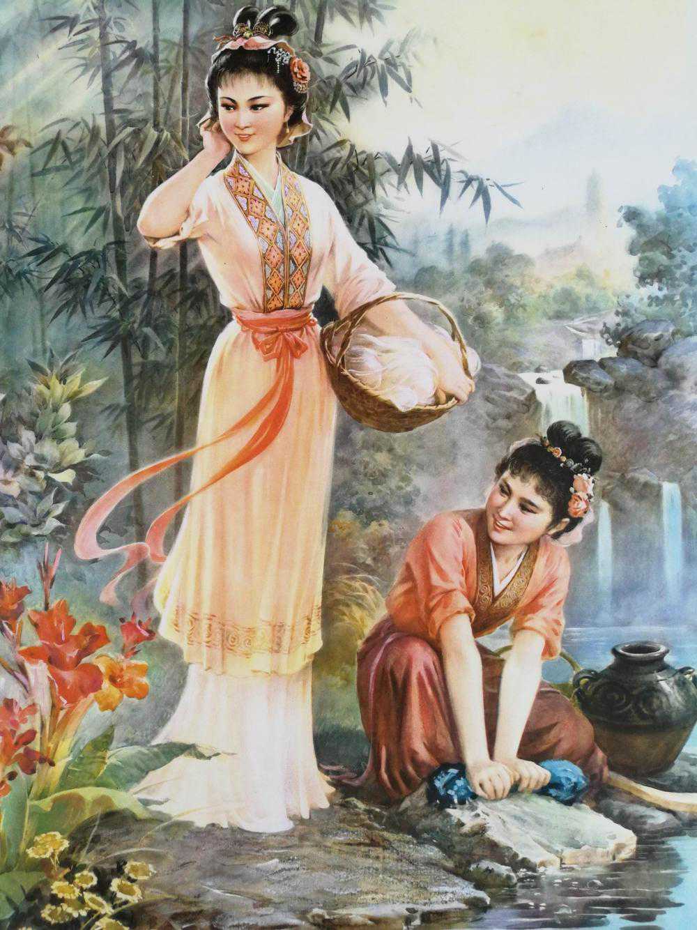 这张西施浣纱挺美,最大的破绽是蹲着搓衣服的妇女,看上去和西施也差不多。