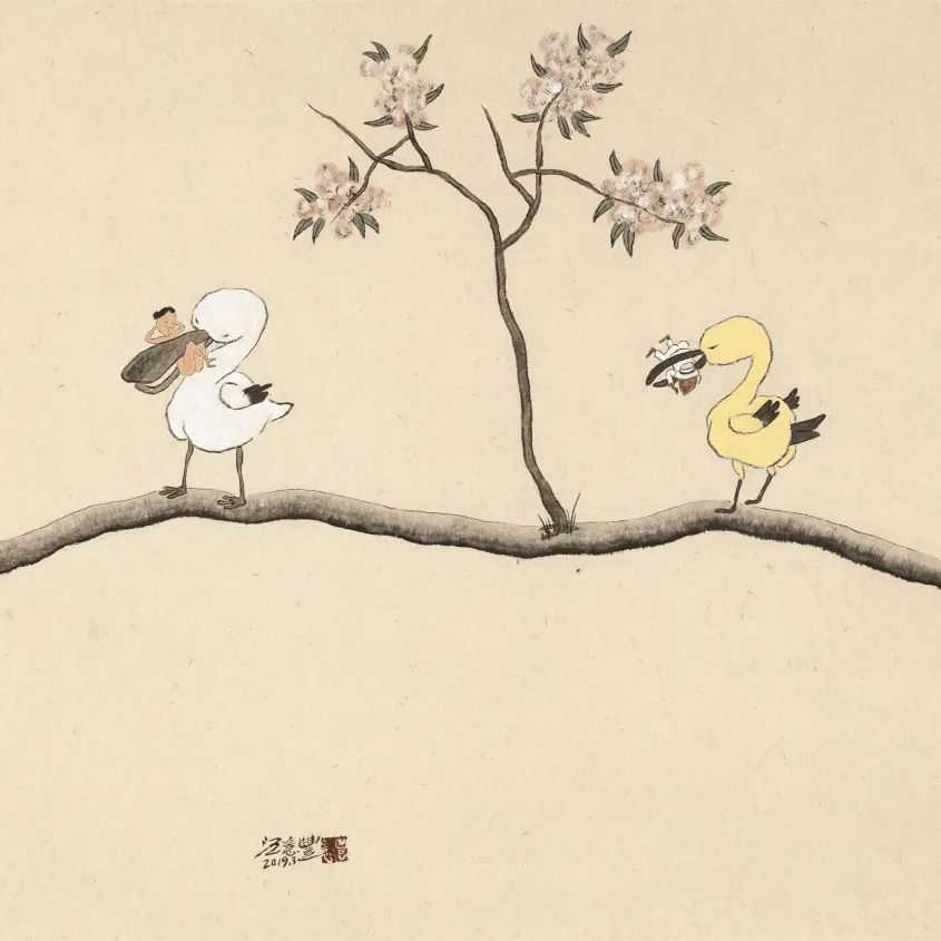 汪意丰的丹青世界真稚充满童趣,充盈的想象和流动的思维不受限制地在画中表现出来。他创作水墨中国画,在他的画中却不容易看到水墨画的各种程式和传统功底,倒是显得自由而稚拙。