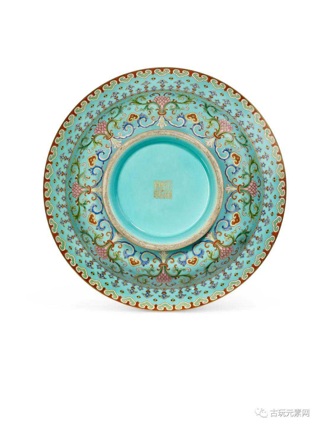 |清乾隆·松绿地洋彩缠枝蕃莲纹仿掐丝珐琅折沿盘|