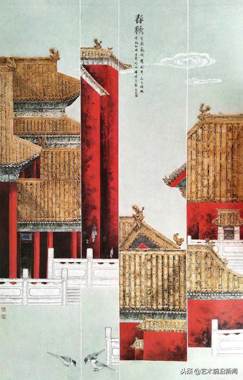 浅绛山水是画家的看家本领,在这里我们好像看到了画家创作旅程的规迹。大江南北的风土人情,三山五岳的绮丽壮美,跃然纸上。作品用笔含蓄稳健,墨色明澈秀润,计白当黑,层次清晰,将在阳光照射或云雾笼罩中的群山的远近隐现之态,表现得惟妙惟肖。章法严谨,技巧精妙,布陈立意,妙合自然。雪景山水为其得意之笔,它塑造了一个静穆、清凉的世界。皑皑白雪笼罩下的群峰溪涧,或高耸入云的积雪奇峰,时见山颠密林寒树丛生,或深山藏古寺,或临渡结茅居,小桥栈道,骑驴觅句,朝钟暮鼓伴随琴韵书声,行旅悬泉充溢着无限生机,天空、水面用淡墨烘托,山脚石坡皴擦减弱而气象雄浑。最见功力的当属界画,它是从楼台亭阁等建筑物为题材的绘画,如字中之楷书,禅门之戒律,画家之玉律;稍有疏忽便前功尽弃。画家深谙宋人界面之真谛,一点一画均无败笔,远山近水,殿堂回廊,人物舟楫,花木竹石,无不苦心经营,细心落笔,笔法秀劲,赋彩古雅,韵味清远,突破唐人浓郁之气。近几年画家创作了大量金碧山水,展出的作品也多为金碧大青绿。这种青绿为质,金碧为纹的山水画,极富装饰效果;它始于隋而成于唐、宋元以降,代有传人,不绝如缕。因其制作繁复,笔法精细,近代画坛专攻者绝少。画家不畏艰辛,十日一石,五日一水,三矾九染,描金嵌点。画面景物丰富,安排严整有序。青山滴翠,碧波粼粼,寺观村社,刻画精微。点景人物,栩栩如生。丘壑峻峭,构图雄奇,彩色富丽,意趣隽永。