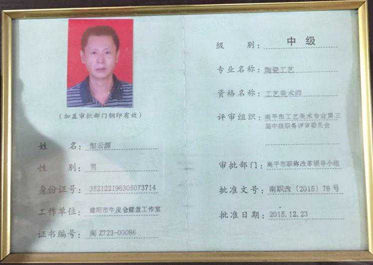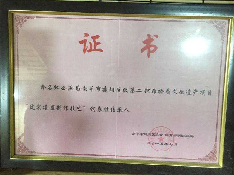 功夫不负有心人,半年多的坚持,第一只兔毫盏终于在邹云源手上成功烧制出来。此后,犹如上天的眷顾,一窑更胜一窑,渐入佳境的邹云源没有就此止步,兔毫、油滴、鹧鸪斑……越来越多的器型、斑纹在他的手中诞生,他的建盏也以精美的器型,古香古色的韵味受到业界的广泛认可,先后获得多个行业金奖。2015年,邹云源被建阳区人民政府授予建窑建盏烧制技艺代表性传承人。