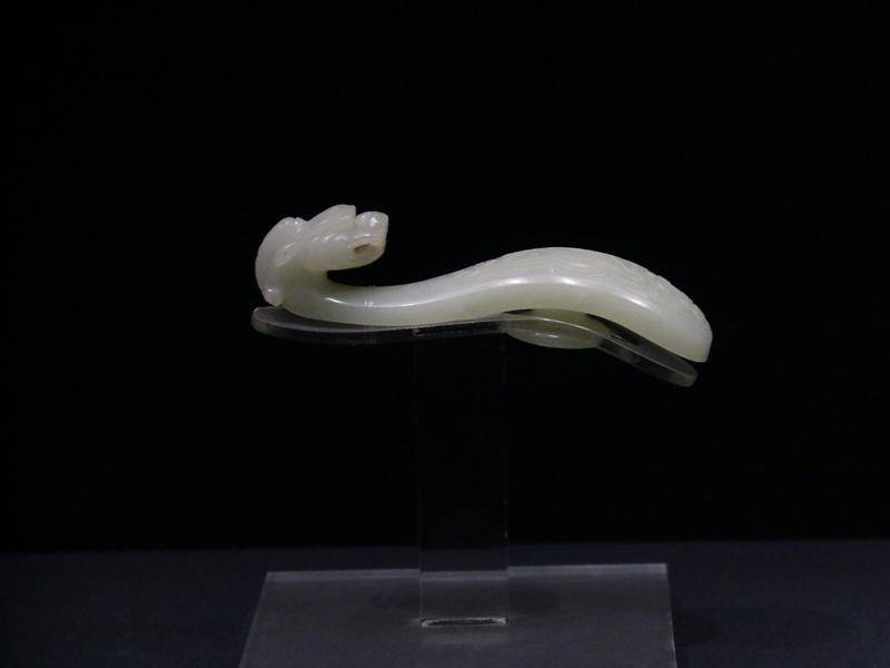 带钩是生活必需品,但有社会等级之分。一般老百姓很难使用玉制的,所以这里展陈的几件龙形玉带钩应当是达官显贵才能使用的。