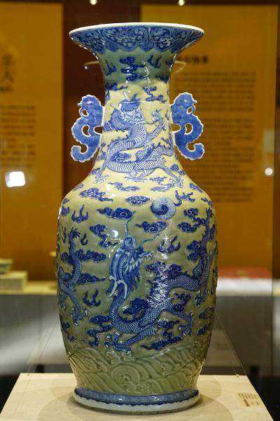 咸阳龙文物贺岁展另一个独立展柜中展陈的文物,是一件咸阳市工会移交的清代青釉蓝花云龙纹瓷尊。