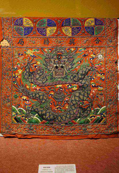 咸阳龙文物贺岁展还展陈有一件正红底色的民国时期的蟠龙戏珠织绣轿帘,为咸阳市彬州市文化和旅游局所藏。