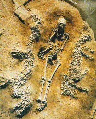 另一件非常重要的龙,出土于河南省濮阳市西水坡遗址仰韶文化墓地,距今约6500年,是用蚌壳拼砌而成的龙形象,长1.78米,龙首、龙身、龙尾、龙爪一应俱全,就连眼、耳、角、舌这样的细节也清晰可见。与蚌塑龙共出的还有蚌塑虎,它们被精心地摆砌在墓主人身体两侧。