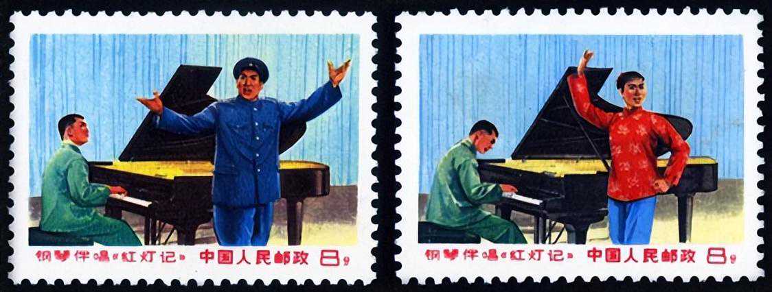 在这样背景下,1969年8月1日,中国邮政发行文16“钢琴伴唱《红灯记》”邮票。这套邮票在设计上选择剧中的两个主要人物最富表现力的舞台形象,设计简单,主题鲜明,很能表现当时的时代特点。