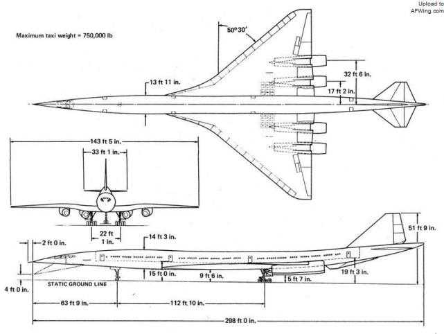 波音2707-300三面图,采用4台通用电气公司的GE-J5P加力涡喷发动机
