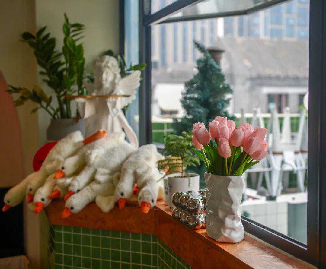 这是一家温柔而治愈系的奶油风甜品店,清新绿的色调点缀在淡奶黄的墙壁间,阳台上的郁金香与玩偶正在熟睡,不同于其它地方的嘈杂,在这里,自成一方天地,无人可扰,岁月静好。
