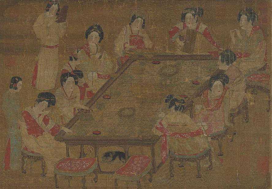 本幅画后宫女眷共十人,围坐在一张长方大桌的四周,有的饮茶,也有人正在行酒令;上方的四人,则是吹弹乐器,替这一场宴饮的人助兴。她们所持用的乐器,自右而左,分别为胡笳、琵琶、古筝与笙。站立的二名侍女当中,还有一人手拿拍板,敲打着节奏。虽然全画描写的是奏乐与饮茶、喝酒的场面,但每个人脸上漠然的神情,却又道尽了宫中日月长的无奈!