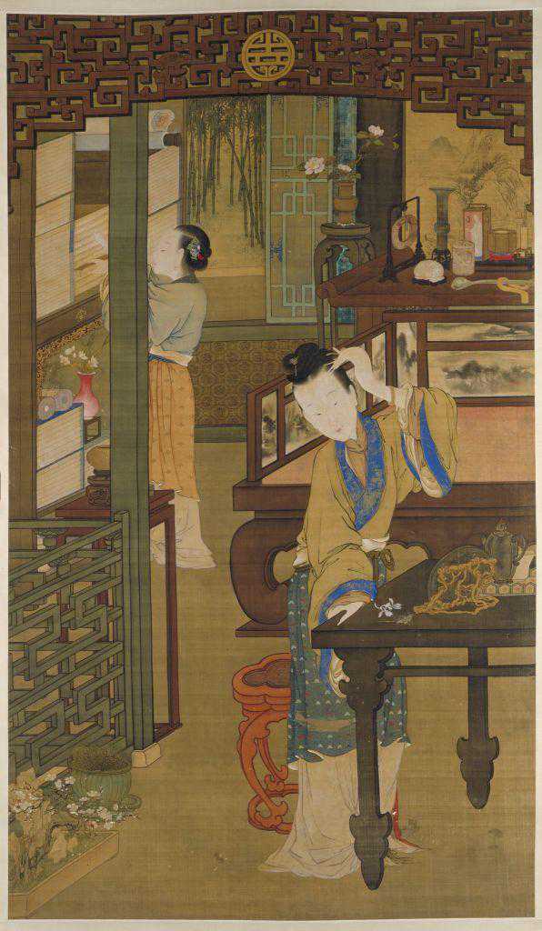 此图旧传为唐人画作,但据其谨细缜密的画风和图中所陈设的器物的造型、装饰等,当出自南宋画院画家之手笔。