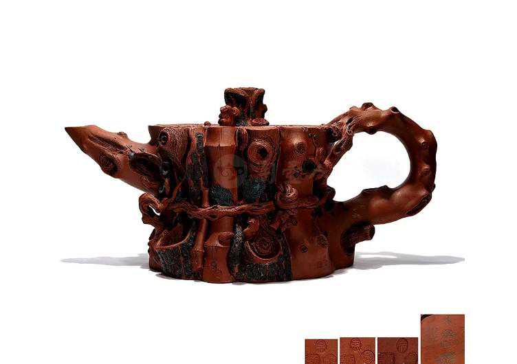 壶身将松、竹、梅三树段束于一体,竹节、松鳞及梅枝的瘿节、花卉等均刻画精致入微,肌理自然逼真。流、把比例加大,气势十足,多种元素自然夹置,于繁复中见规整,加之松鼠雕塑,更添灵巧意趣,精湛娴熟之技艺,不言而喻。