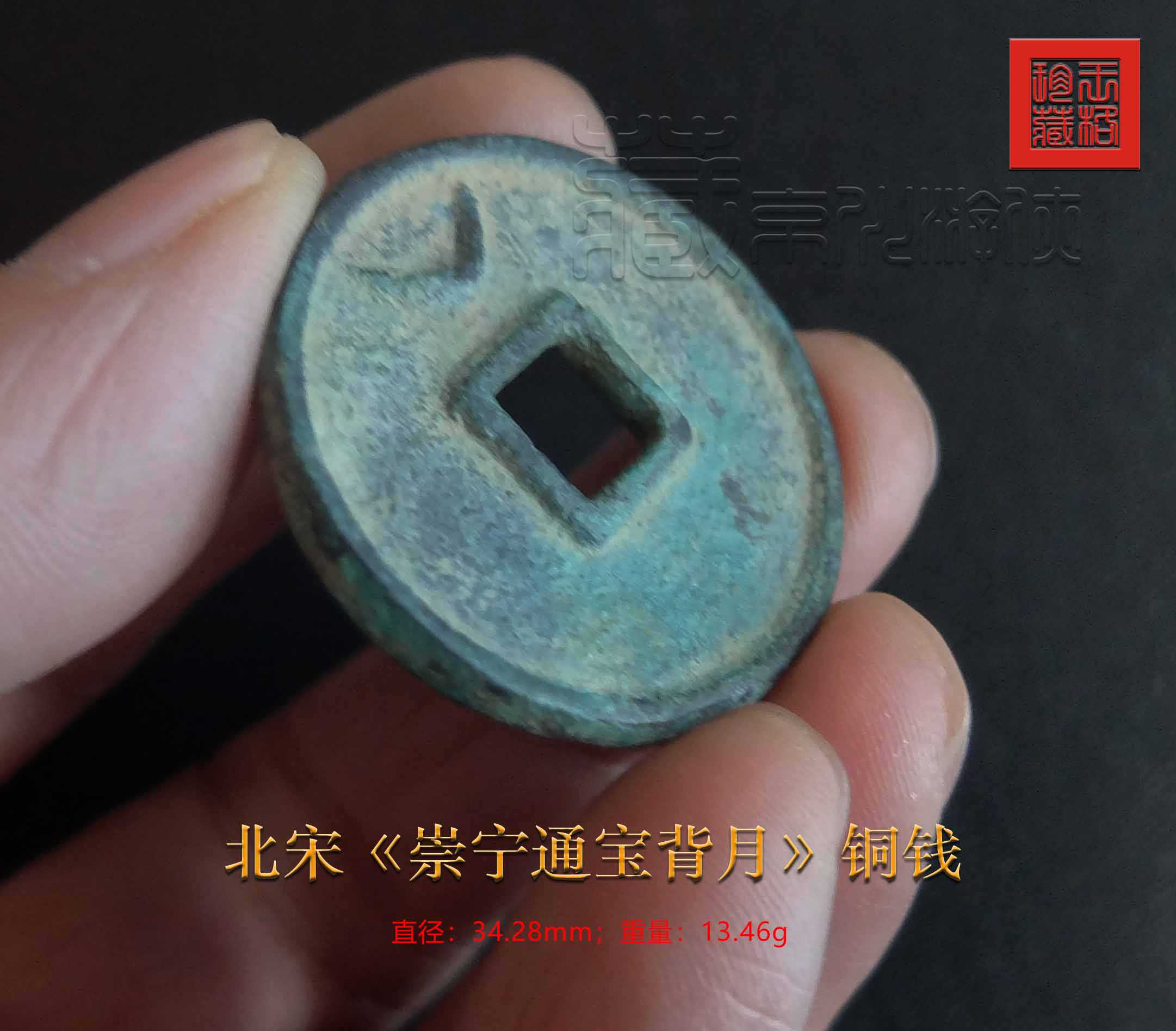 首识书相。清晰可识,其面文“崇宁通宝”四字,典型瘦金书书体,笔划凸显骨力,刚柔相济,起收有顿,转折见锋,横直竖立。观其钱文,布局协调,一句话,其力道神韵彰显徽宗瘦金书之端庄隽美。而续观其背,但见穿上一枚硕大仰月纹,清晰自然,当为极其罕见。故而,品文识书,由其书相纹相来看,其门已然得开,不必赘述。
